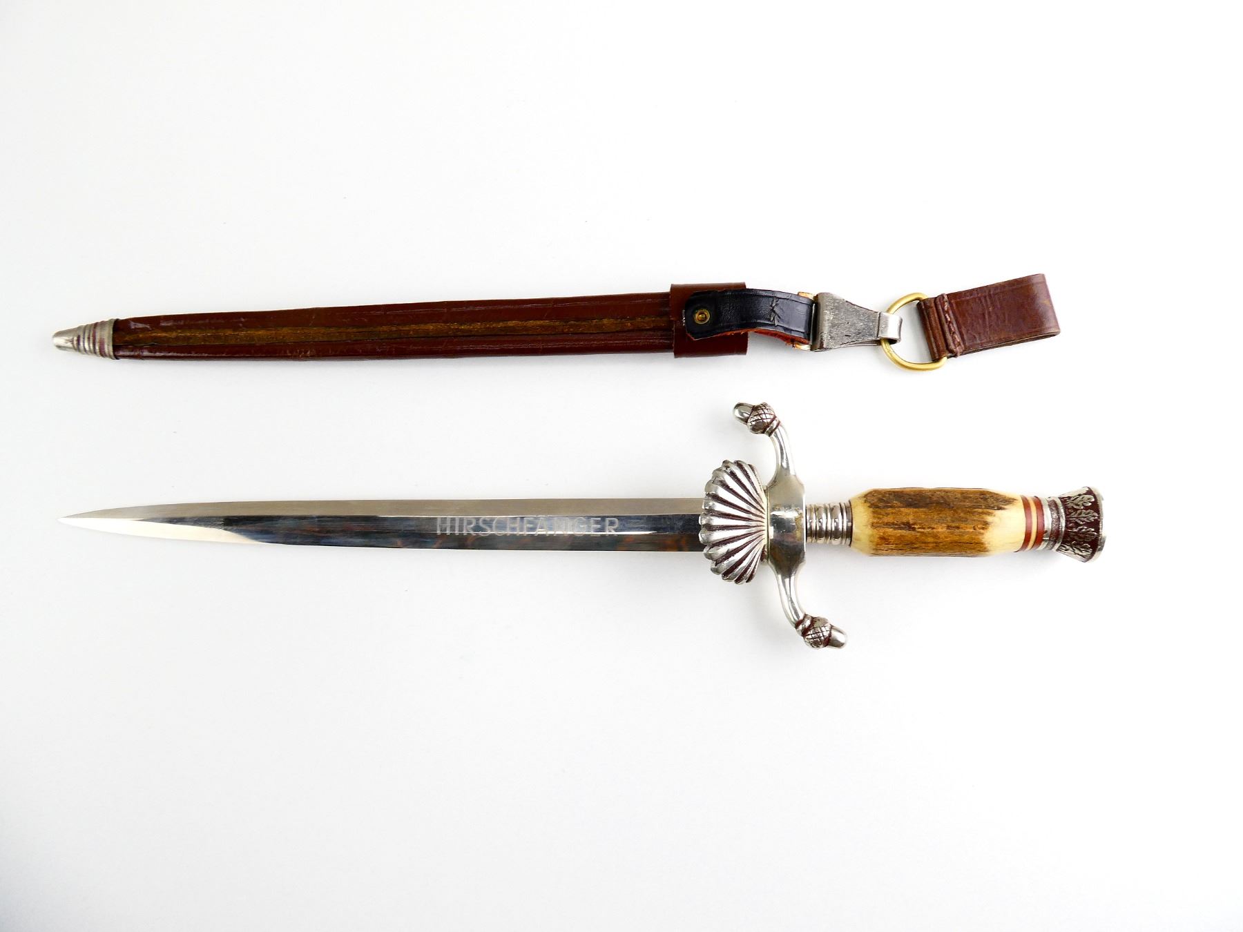 (1) STEEL ETCHED BLADE MARKED: "HIRSHFANGER", METAL ACORN GUARD, HORN / BONE HANDLE, METAL POMMEL, BROWN LEATHER & METAL SHEATH, BLADE APPROX. 10.25" & OAL APPROX. 14.75". SEE PHOTOS.