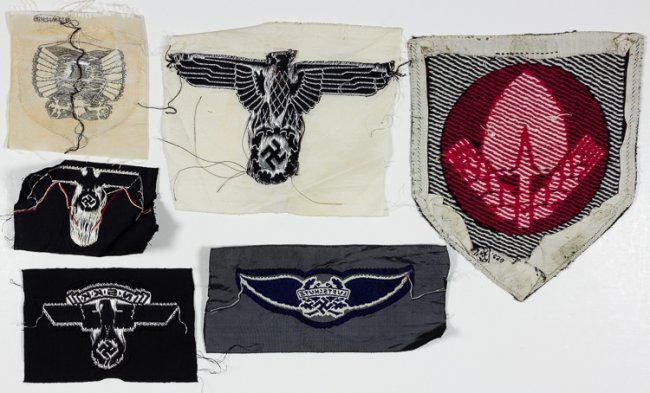 Lot of six pieces of varied machine-woven insignia, almost all BeVo-type, includes N.S.K.K., R.A.D., Luftschutz, cap insignia, etc., all very good. Sold as a lot, as is and should be inspected.