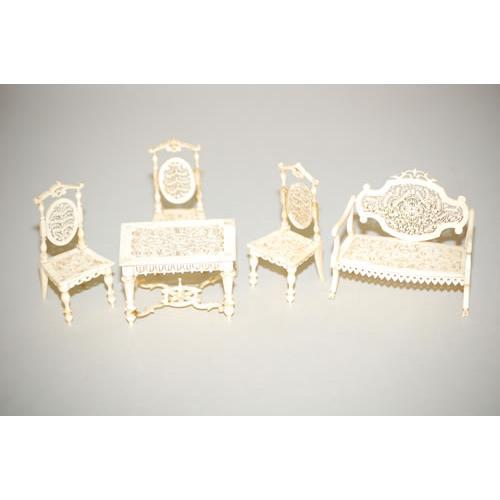 GERMAN IVORY MINIATURE FURNITURE SUITE - 20TH CENT.<BR>5 PC. MATCHING MINIATURE GERMAN CARVED IVORY PARLOR<BR>SUITE: TABLE, CHAISE & 3 CHAIRS W/ PIERCED CARVED &<BR>TURNED IVORY ELEMENTS-VARIOUS SIZES - WEAR, BREAKS &<BR>REPAIRS, IMPERFECTIONS