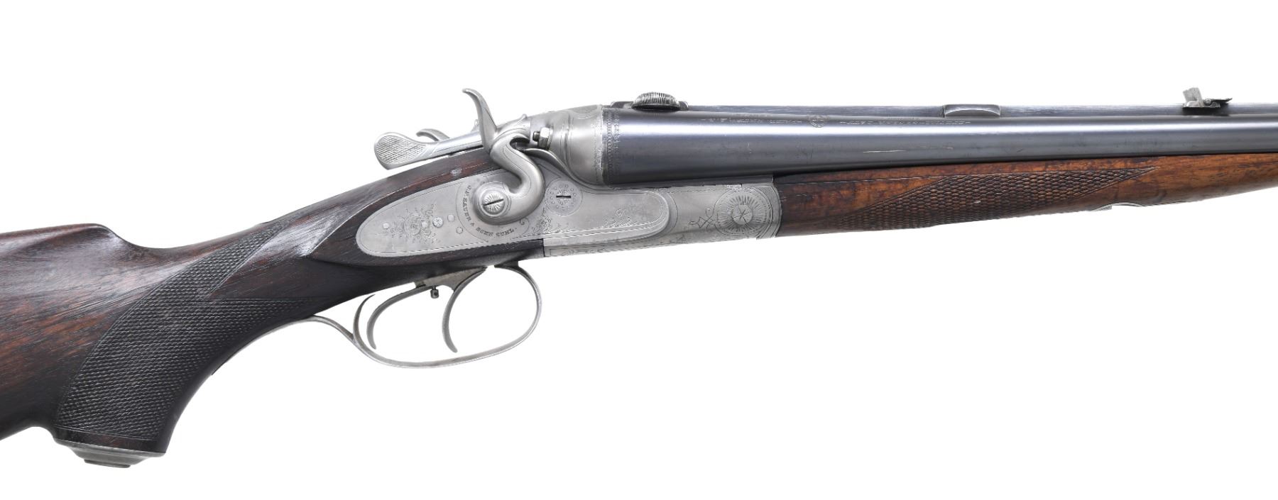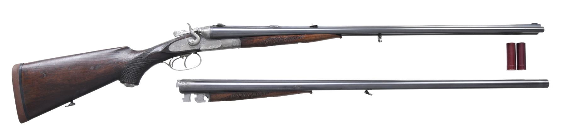 GUN TWO BARREL SET. S# 233470/1 (mfg. April 1925). Barrel 1 (cal. 16 Ga., 2 1/2" / 8.8x72R) has S# 233470 being 26 3/4" with bead front sight, 2 leaf rear sight & claw mounts on matted rib. Fixed IM choke. Barrel 2 (cal. 16 Ga., 2 1/2") has S# 233470 being 26 3/4" with bead front sight, 2 leaf rear sight & claw mounts on matted rib. Fixed Full chokes. Both water tables shows April 1925 German Nitro proofs. Both barrels have sling swivels, checkered splinter forearm with matching numbered irons & Deeley releases. Hammer side locks with scroll engraving; action features double triggers & extractors. Walnut stock set w/ checkering, steel grip cap, Bavarian cheekpiece & sling swivel. LOP: 13 7/" to replacement Old English pad. UNATTACHED ACCESSORIES: 2 A-ZOOM Snap caps & barrels as described. CONDITION: both barrel sets have good blue with scattered pinprick patina, marks & large spots of cleaned pitting. Forearm #1 in fair condition showing significant deep dents that go through the checkering. Forearm #2 in good condition showing dents. All bores of both barrels in very good condition showing light fouling in shotgun bores & throat of rifle bore showing wear. Receiver has cleaned gray patina appearance with areas of prior pitting & marks. Good wood finish on buttstock with small cracks & scattered dings. (25-748/MD). CURIO. $1,750-2,500.