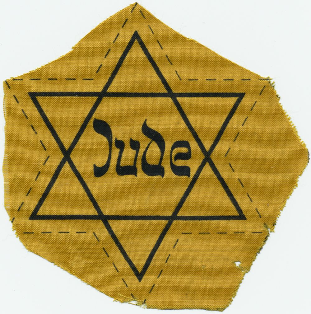 Unused yellow cloth "Jude" patch obliged to be worn by Jews so as to be readily identified by government and military authorities. This example, ex: Israel, was hastily cut from a larger sheet printed with the same design which measures about 4 1/2" across. Fully consistent with legitimate examples. A number of stars of this exact type, issued in Germany, survived the war, presumably kept by those who survived or escaped.