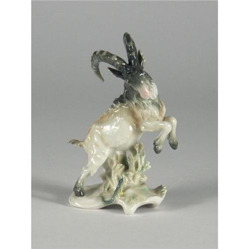 PORCELAIN: A German Karl Ens (1900-) hard paste polychrome porcelain figurine, scared ram goat rearing at a snake in the grass. The ram measures 7'' x 4.5. Hallmarked on underside.