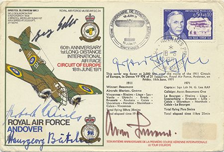 Commemorative postal cover honoring the first long distance air race and picturing a Blenheim bomber, June 18, 1961, signed on the face by aces ADOLF GALLAND, GERHARD SCHOPFEL, HERBERT KAISER, GEORGE-PETER EDER, HANNSGEORG BATCHER. Very good, with five mounted photos of each.