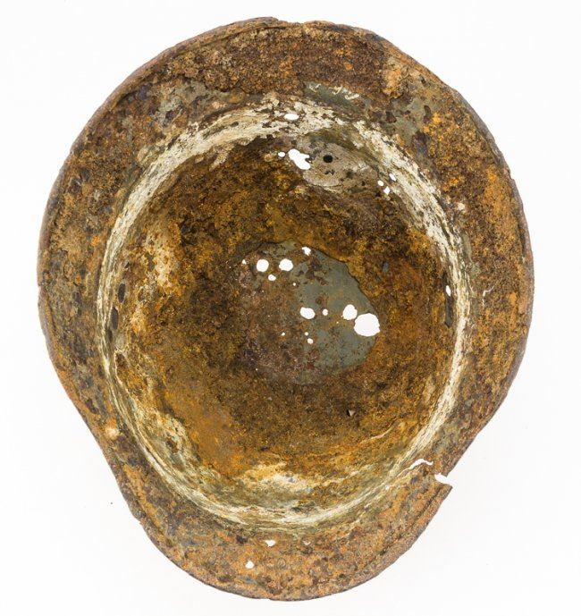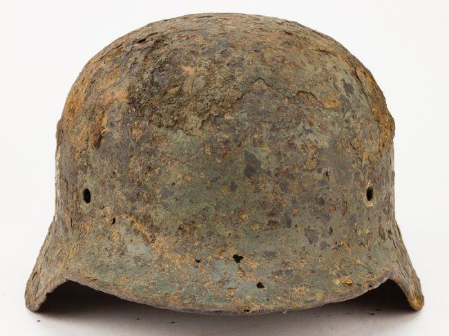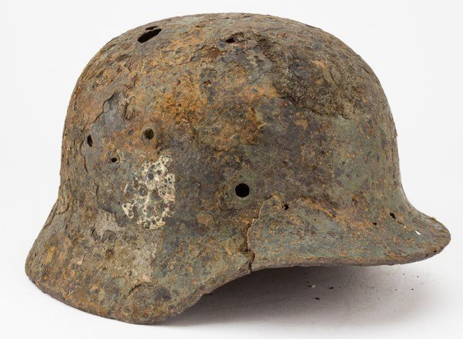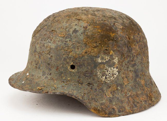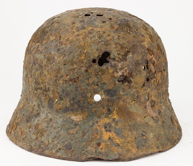 German M1935 combat helmet, of the type used by German soldiers throughout the conflict. The helmet is a dug relic, and is very heavily oxidized, with several holes in the crown and a 2"crack on the right side of the visor. Despite this, much of the green paint is still present, inside and out. The helmet features a shield-shaped decal on each side, although they are so corroded as to be unidentifiable. The leather liner and chinstrap are missing, and the interior is covered with a layer of rust. Barely visible at the rear inside brim is an identifying mark in white, although it is illegible and obscured by rust. Sold as-is.