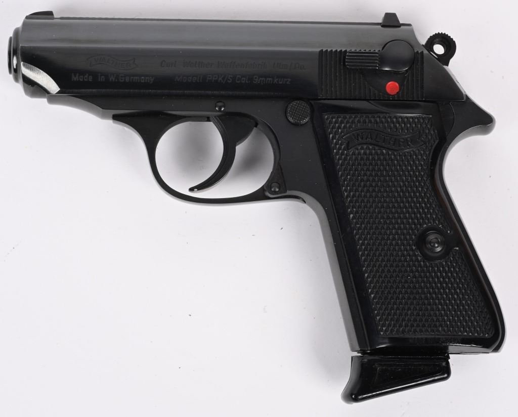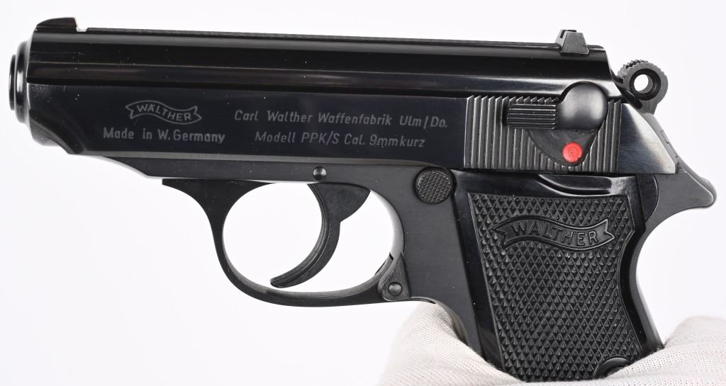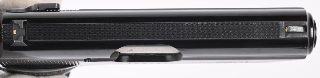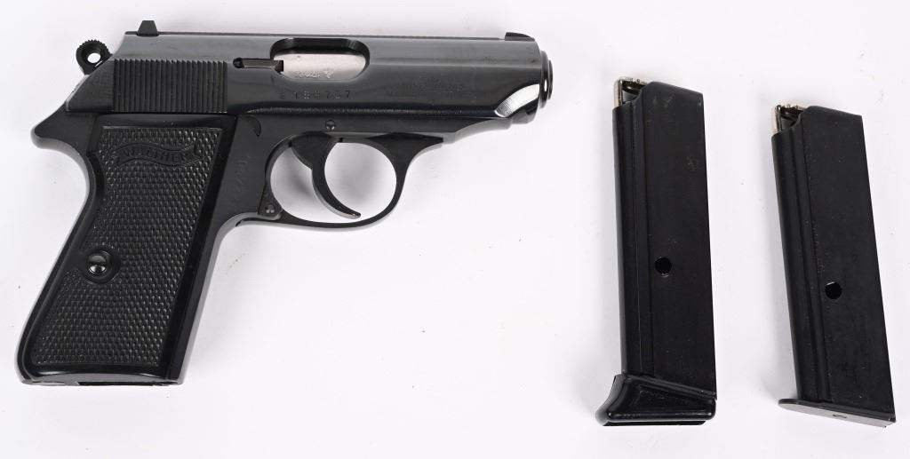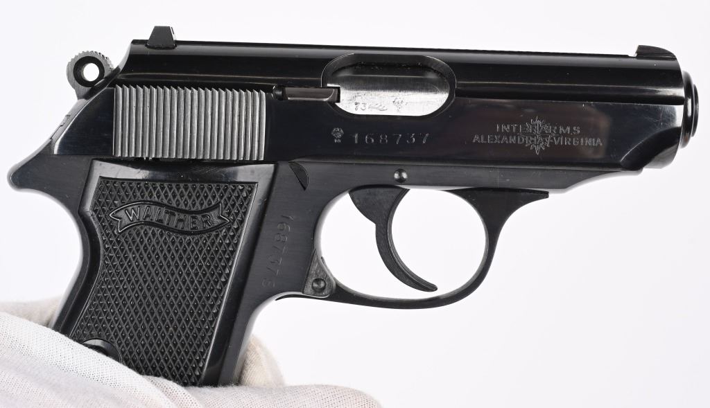 SERIAL NUMBER 168737S BARREL 3 1/4" CALIBER 380 ACP / 9MM KURZ MANUFACTURED 1973. Blue finished with checkered black plastic grips with Walther monogram. Date code proofed in 1973. Commercially marked for INTERARMS ALEXANDRIA VA. in numbers matching box with full label, both finger rest magazine and flat base magazine, test target and instruction manual. CONDITION. Extremely fine and appears to as new with no use evident. Box and paperwork are equally fine. C&R