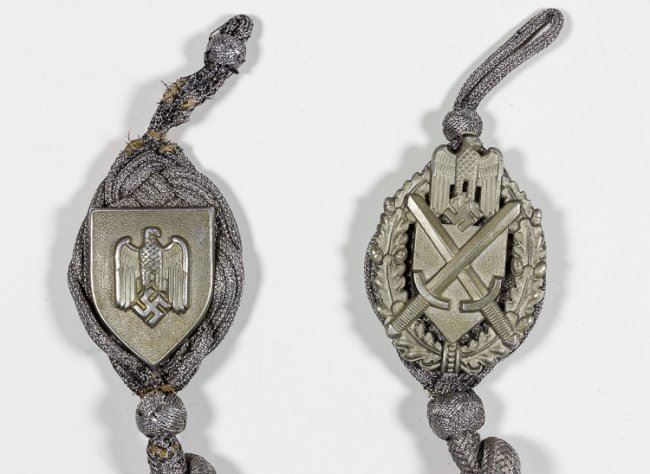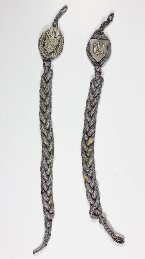 German Army/Waffen-SS Marksman lanyards, multi-piece with wool backing. Shield-type is worn, else very good.