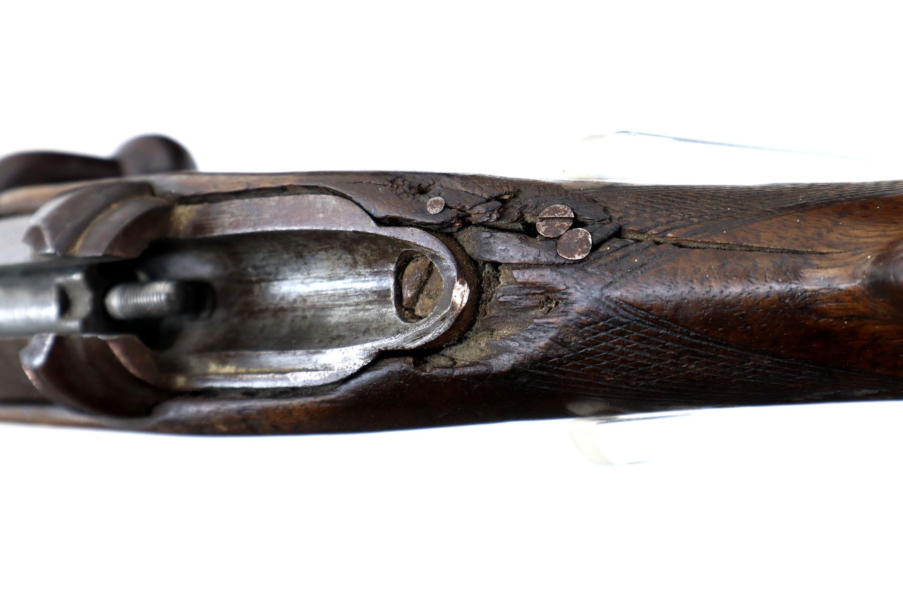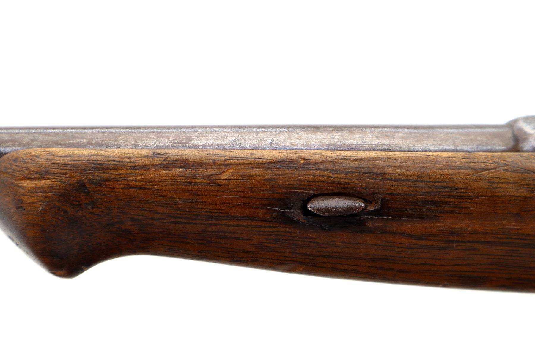 Main Description: This shotgun has a welded chamber and bolt is incomplete. Has brass bead, round barrel, hex receiver, turned down bolt handle. One piece wood stock, Schnabel forend tip which is cracked, single forearm wedge, checkered pistol grip, chipped cracked and broken around receiver, smooth steel butt plate, trigger guard is loose and has a rear sling swivel only.