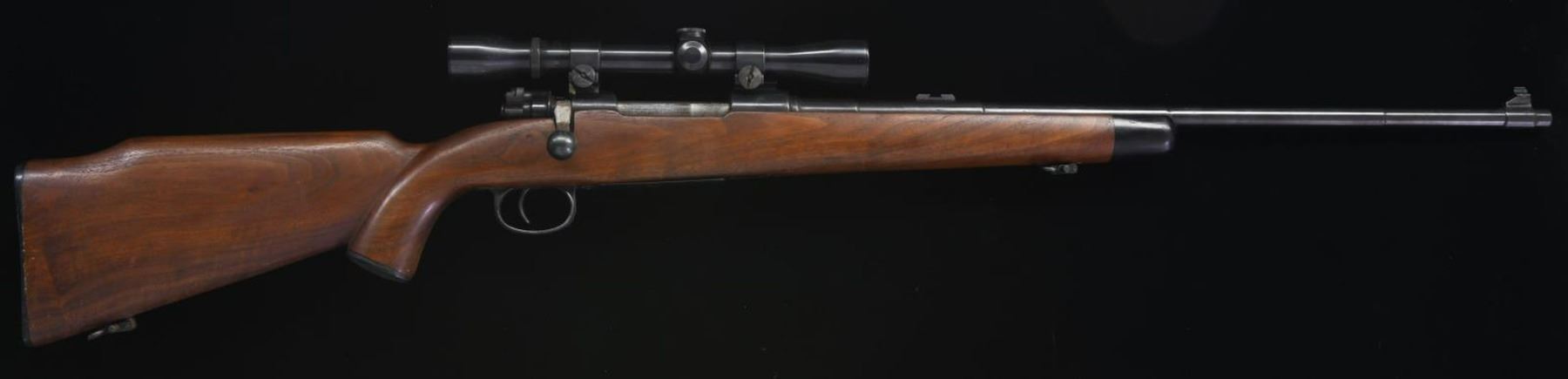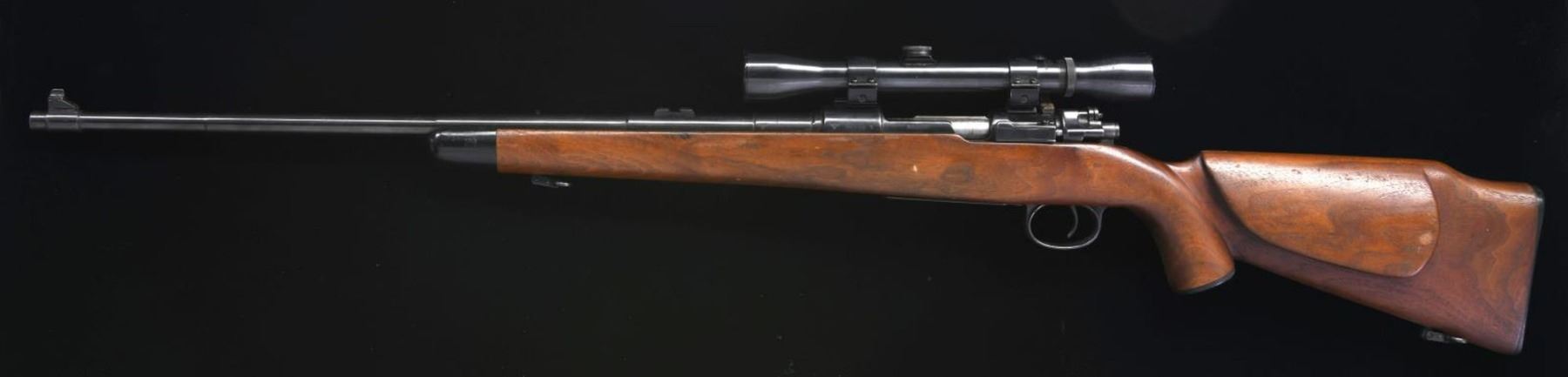 RIFLE. Cal. 8mm Mauser. S# 36560a. S# matches on receiver & trigger guard assembly. Bbl. 23 3/4". Original rear sight has been removed and barrel is fitted with a screw on dovetail base. Original front sight blade has been replaced with a Redfield sporting bead. Receiver drilled on top for Weaver bases and 1" rings. Weaver K4 scope with steel tube marked "60-B". Fine cross hair reticle. Bolt handle has been altered to clear scope by welding and grinding with hobbyist gunsmith workmanship. Replacement safety to clear scope. Walnut Bishop Sporter stock with Monte Carlo comb and raised cheekpiece fitted with 1" QD swivels. Checkered plastic buttplate and grip cap; black forend tip. Stamped trigger guard with removable floorplate. CONDITION: stock set has light wear and scattered handling marks throughout with scattered small spots of paint. Notable crack behind receiver tang. Inletting and shaping are hobbyist gunsmith workmanship. Metal retains 80% professional blued finish with thinning and light wear. Bolt handle seat has been ground for clearance. Fair worn bore turning dark. Scope is slightly cloudy with several visible chips but appears serviceable. (23-5376/RW). MODERN. $300-400.