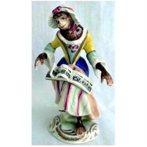 German Meissen style monkey band figure after model by J.J. Kandler and possibly Peter Reinicke. 1 of a group of 13. 3 7/8" high. Scroll moulded gilded base. Satirical monkey musician - lady singer, holding a large book of music. 18th century court attire: Yellow top, blue skirt with striped in the front. Marks: Blue Crown with "N" over crossed swords. Impressed mould numbers. Condition: She has lower part of a leg missing otherwise, no damage.