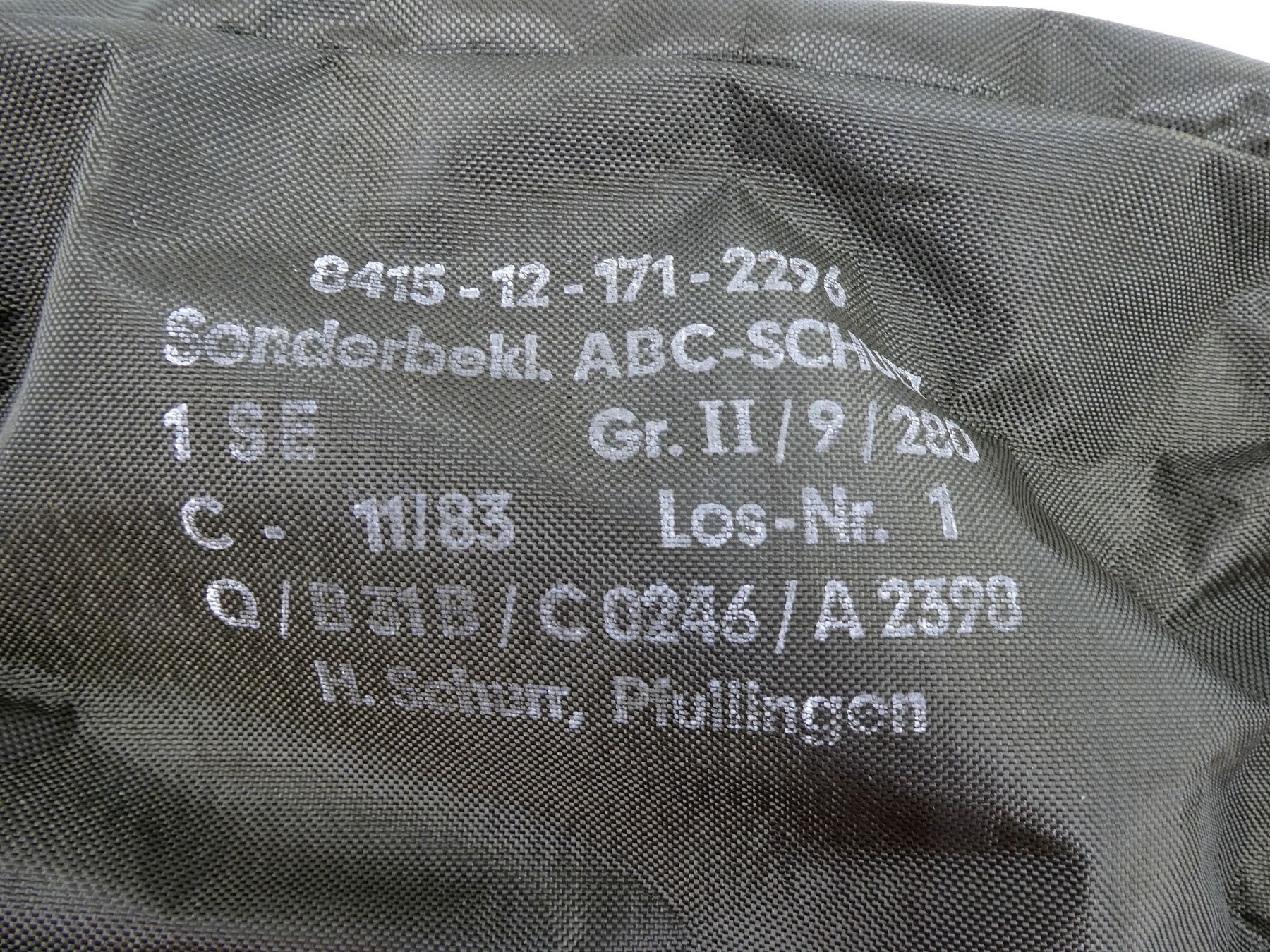 (1) GREEN NYLON, APPEARS NOS, IN CARRIER BAG, BAG MARKED: "SONDERNEKL, ABC-SCHUTZ, H.SCHURR, PFULLIGEN, DAT. 11 / 83, 8415-12-171-2296", ETC., APPROX. SIZE: MEDIUM. SEE PHOTOS.