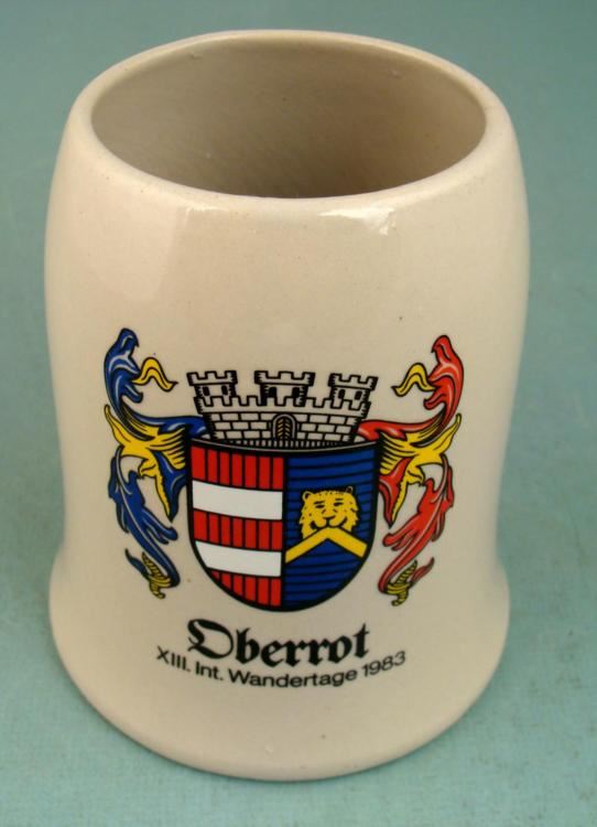 HERE IS A NICE GERMAN STEIN/MUG FROM THE OBERROT REGION OF GERMANY. IT IS COMMEMORATING THE 13TH INTERNATIONAL "WANDERTAGE" OR "MIGRANT DAYS" IN 1983. IT IS MADE OUT OF CERAMIC AND IS A 1/2 LITER. THE MUG IS IN MINT CONDITION.