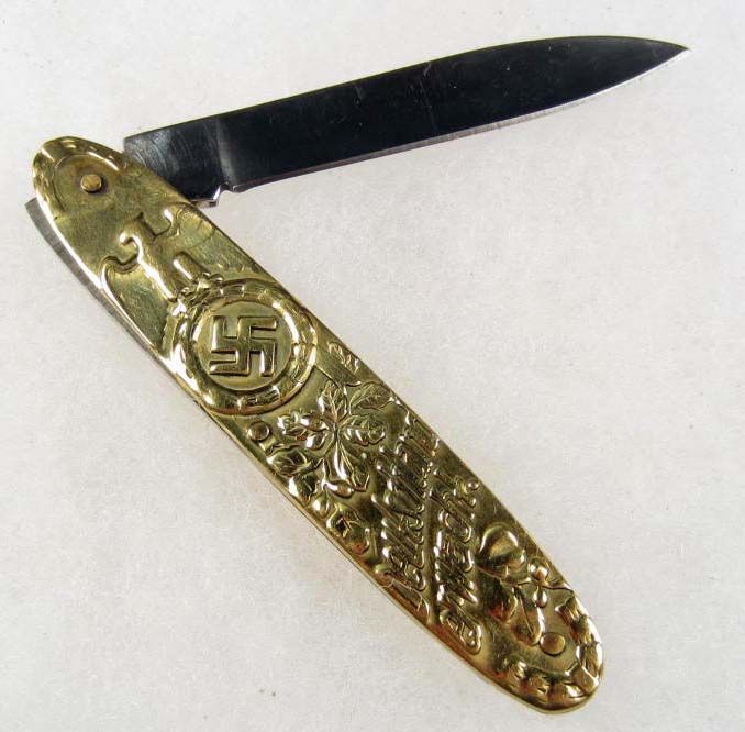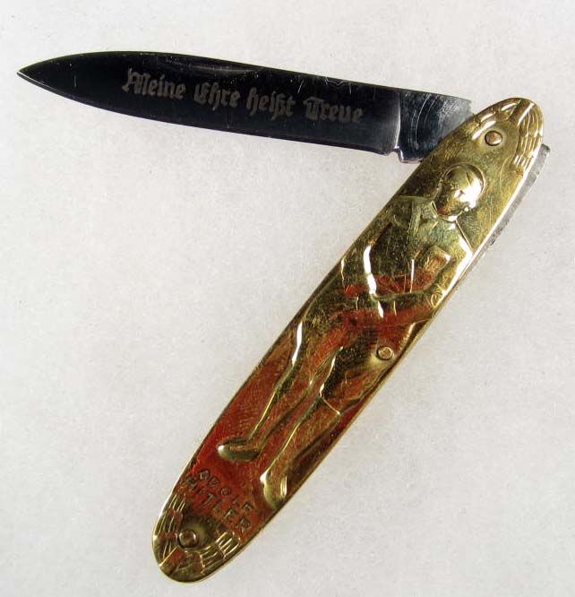 Approx. 5.75" long overall w/ the blade open. The blade is etched Meine Ehre Heisst Treue (My Honor is Loyalty). Brass and steel.