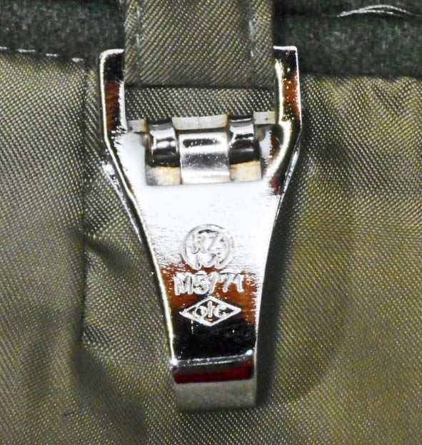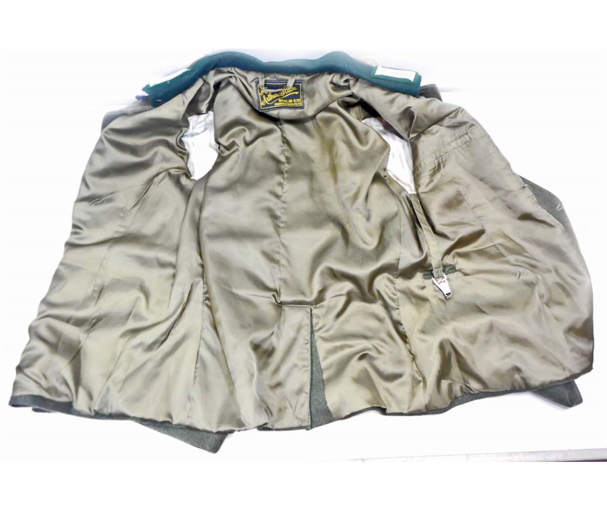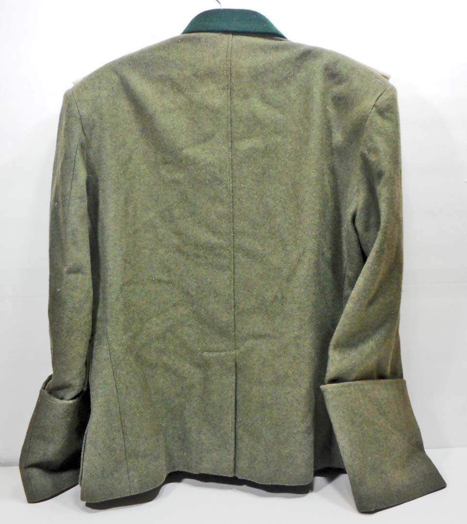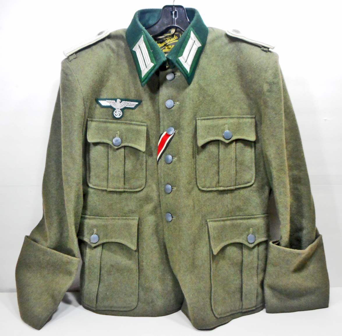 The body is a green wool blend cloth with four pleated pockets. . Has an Army bullion silver wire breast eagle above the right pocket. There is a 2nd Class Iron Cross ribbon sewn into the second button hole. Has a green silk lining. The tailor's label on the inside reads 'K Arthur Kuck Berlin 0.112 Boxhagenerstr.52'. Includes a nickel dagger hanger that is maker marked 'RZM M5/71 olc'. Has a pair of white piped slip on Infantry 2nd LT shoulder boards. The uniform is a medium size. Excellent for display & is in very fine condition.