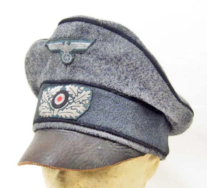 The body is a green wool with black piping. Has a silver bullion flat wire eagle and cockade sewn onto the front. There is a brown leather sweat band on the inside. The interior lining is a grey cotton that has a black Nazi eagle ink stamp on the top. Has a black leather bill on the front of the visor.