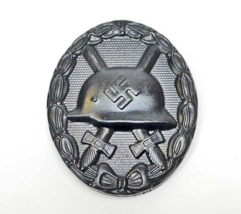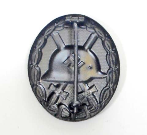 Has a thin vertical 'T' bar style pin back. Black painted stamped steel construction. Awarded for receiving 1 to 2 combat wounds.