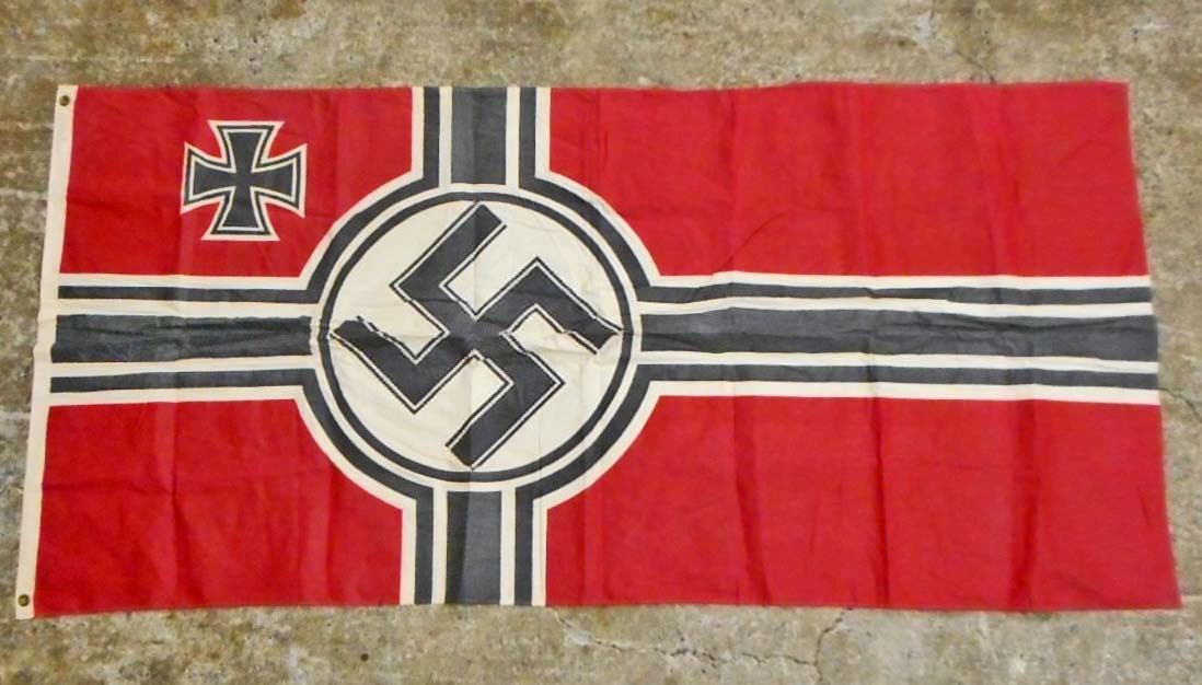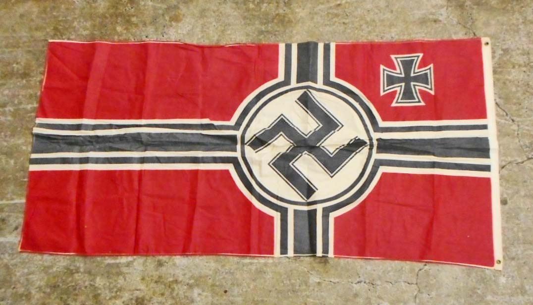 Measures 35 3/4" wide by 71 1/2" long. The flag has a swastika in the center with an Iron Cross in the corner. Has a white cotton bunting on one end for reinforcement. Printed cotton construction. A very fine wall hanger.