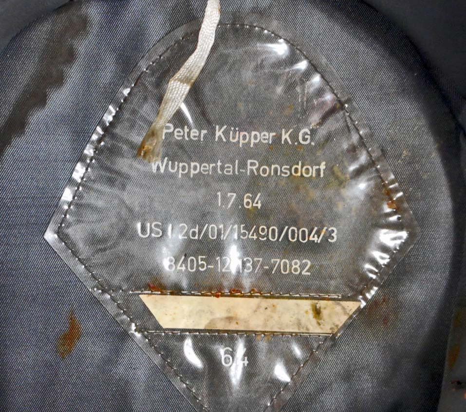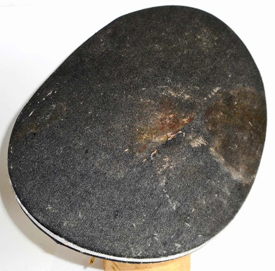 Has a metal eagle and cockade. The body is grey wool construction. It has some mothing. Has silver bullion wire piping. The interior has a makers label along with a grey leather sweat band. Shows use and wear.