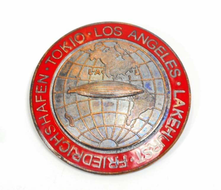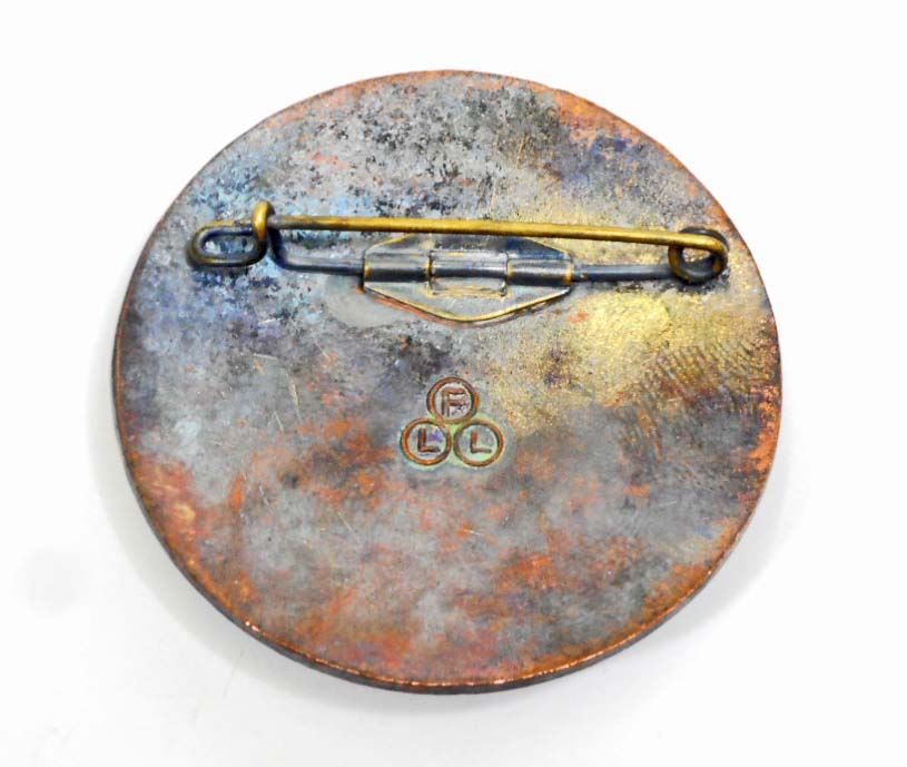 Measures 1 3/4" in diameter. The reverse side is maker marked 'FLL'. Has a thin horizontal pin back. Two piece copper construction with red enamel