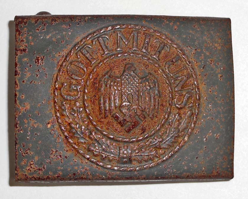 The front shows a flying Luftwaffe eagle in the center surrounded by an oval oak leaf wreath. The reverse side is maker marked 'JFS'. Grey painted steel construction.