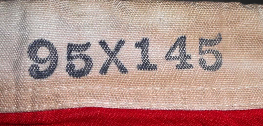 Measures 35 3/8" wide by 57 1/4" long. Has a white cotton bunting with a rope on one end that is marked '95 X 145'. Printed cotton construction.