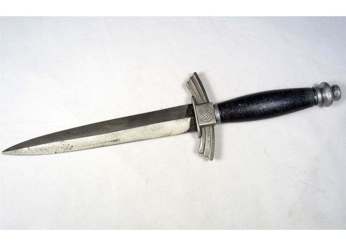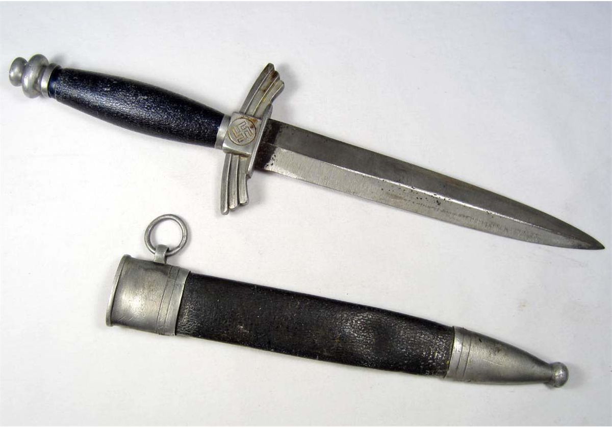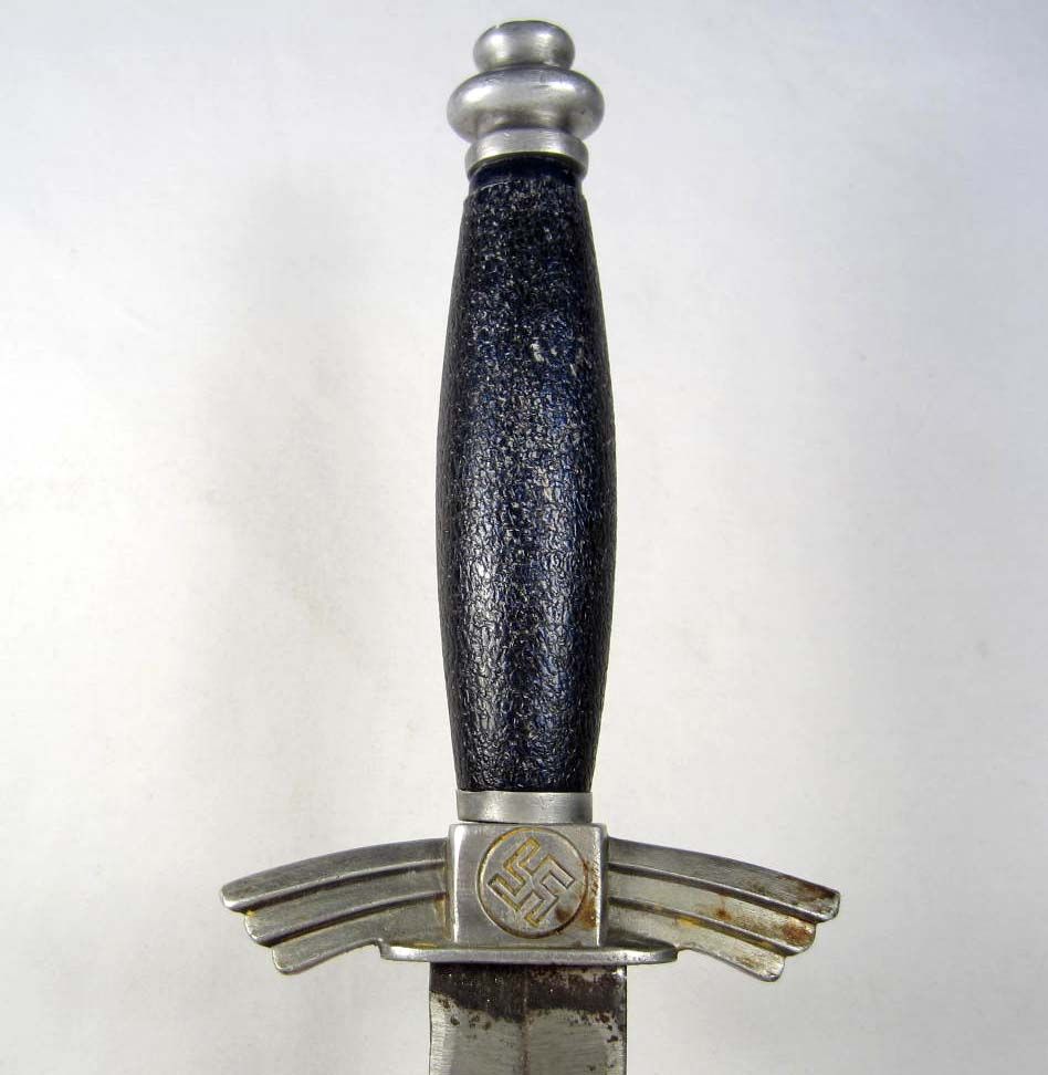 Approx. 13 5/8" long overall. This is the aluminum version w/ a dark blue painted handle and scabbard. Has a steel blade. Rare variation.