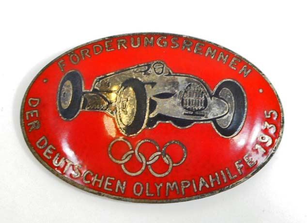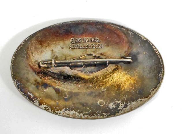Measures 2 5/16" wide by 1 1/2" tall. The reverse side is maker marked 'ges gesch A Stubbe Berlin'. Nickel construction with red and black enamel