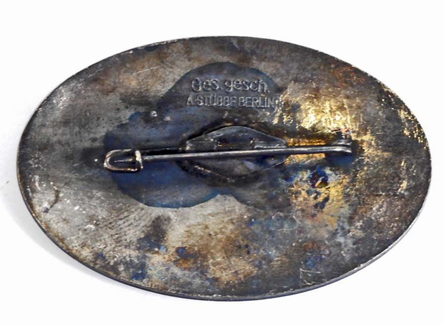 Measures 2 5/16" wide by 1 1/2" tall. The reverse side is maker marked 'ges gesch A Stubbe Berlin'. Nickel construction with black enamel