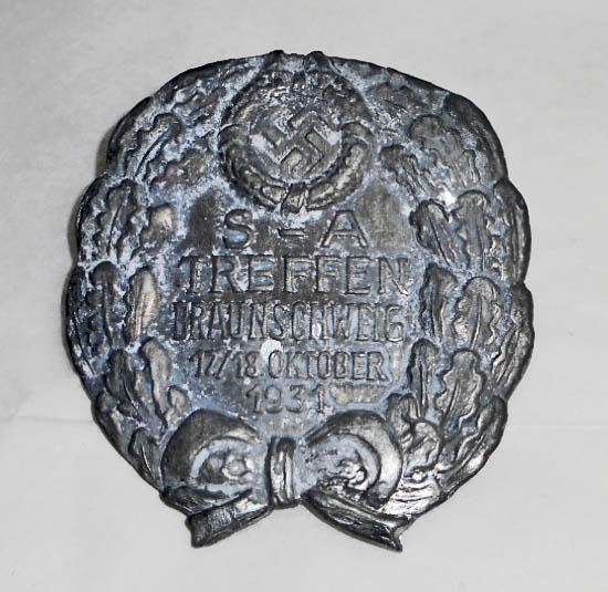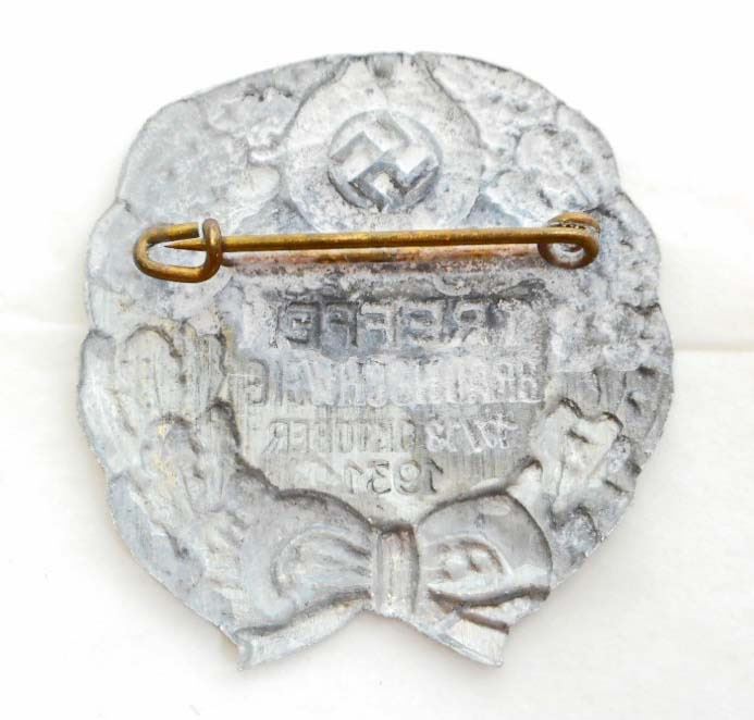 Measures 1 7/16" wide by 1 9/16" tall. Has a thin horizontal pin back. Stamped aluminum construction