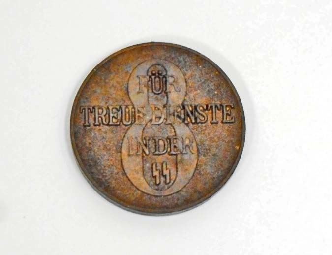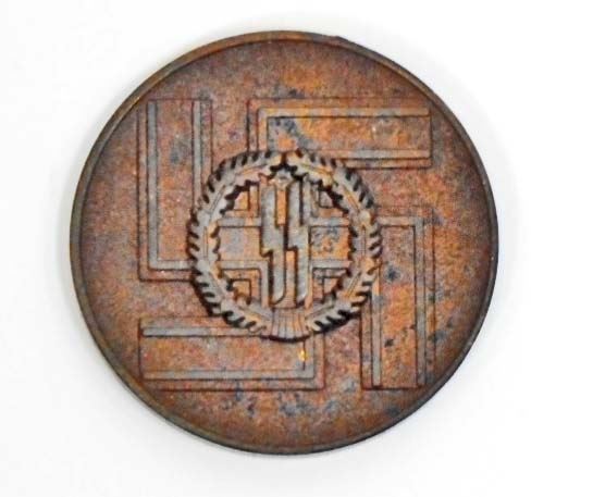 Measures 1 1/2" in diameter. The front shows a swastika with a pair of SS runics in the center. The reverse side shows a # 8. Bronze construction.