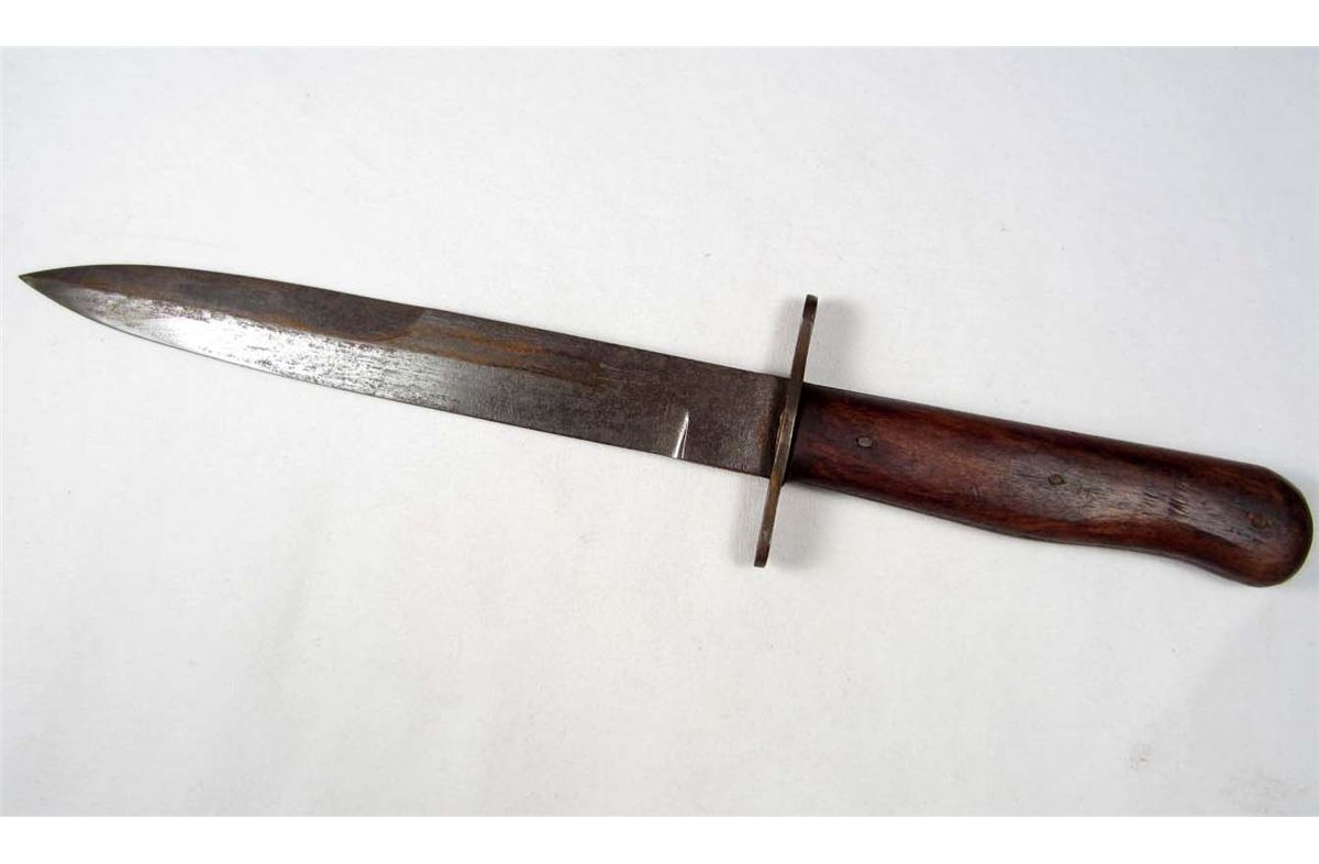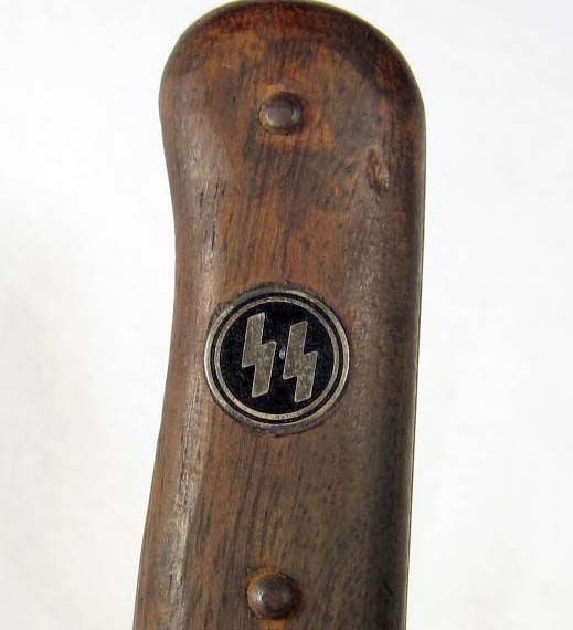 Approx. 11 13/16" long overall. Has a pair of wood handles w/ an SS enameled runic insignia mounted in. Includes a blued steel scabbard.