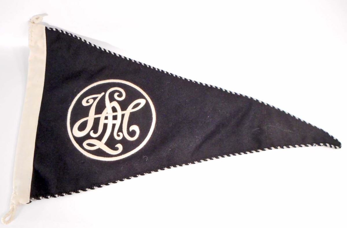 Measures 17 1/2" wide by 10 3/8" tall. Has black and grey twisted piping around the edge. There are machine embroidered letters that reads 'LAH' on a black cotton backing. There is a bunting on One (1) end with Two (2) rope eyelets for securing to the vehicle flag pole. It is marked 'SS 67/43 RZM 26 X 42'. Double sided. Machine sewn construction.