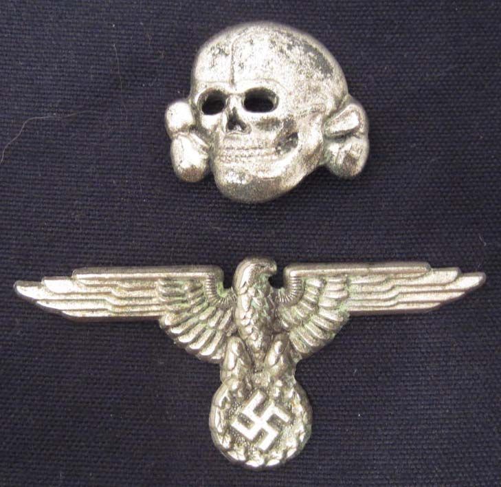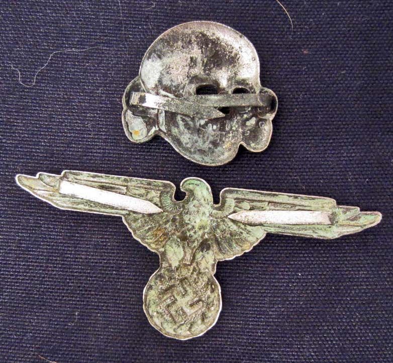 Both feature flat horizontal prongs on back. Skull is maker marked RZM M1/51. Stamped nickel construction.