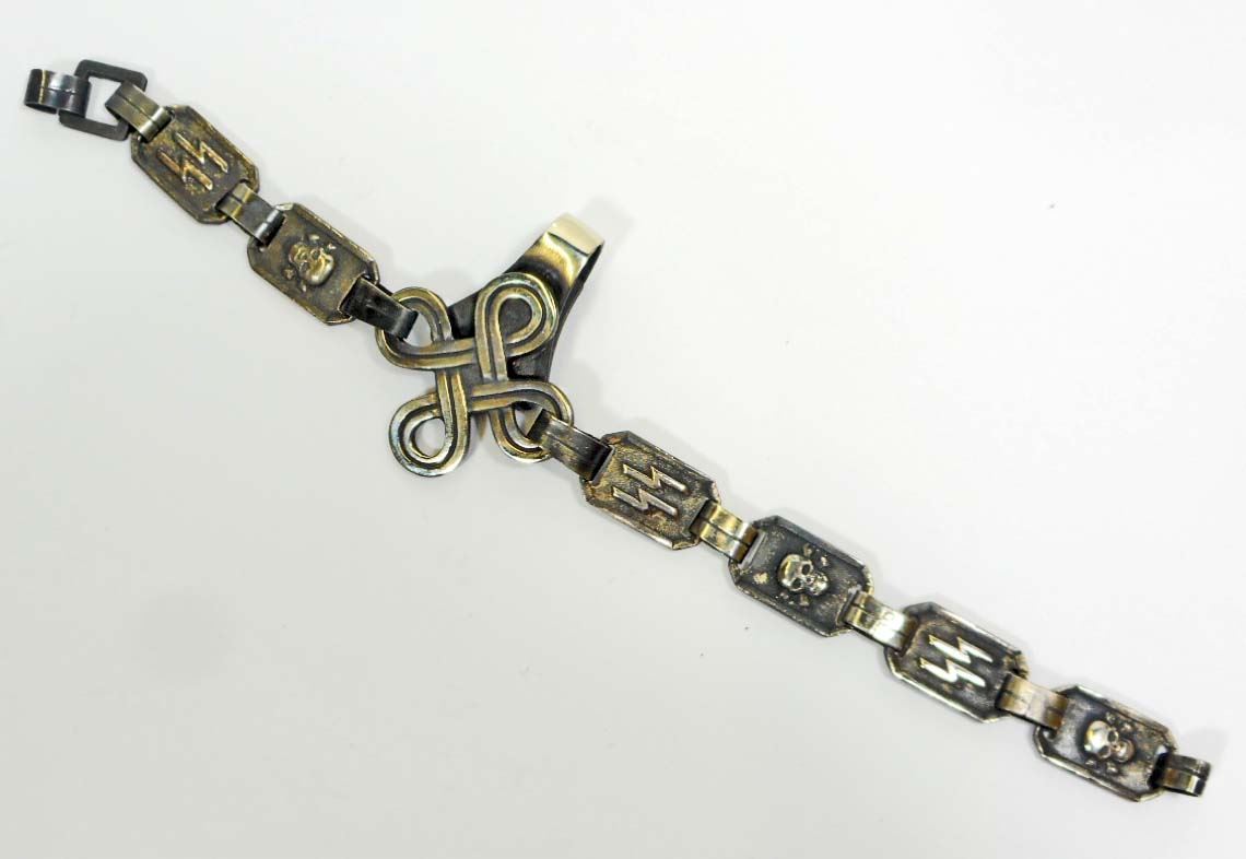 Measures 5 5/8" long'. It contains SS runic links and skull links. One link on the reverse side is stamped with a double pair of 'SS' runics. The clip is in good working order. Nickel construction. RARE.