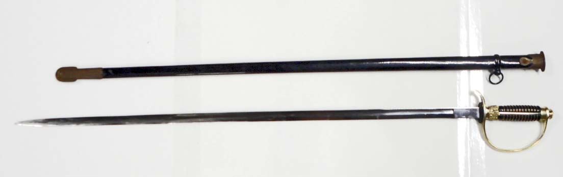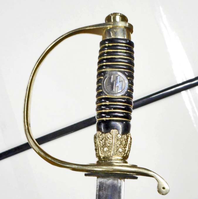 Measures 40 3/16" long overall. The steel blade is marked with a pair of Waffen SS runics. It measures 13/16" wide by 28 7/8" long. The black painted steel scabbard measure 1 1/8" wide by 34 7/8" long. The scabbard fittings and the sword handle are nickel construction