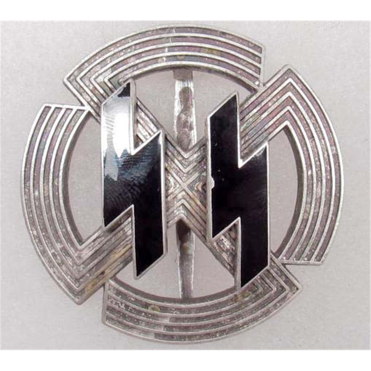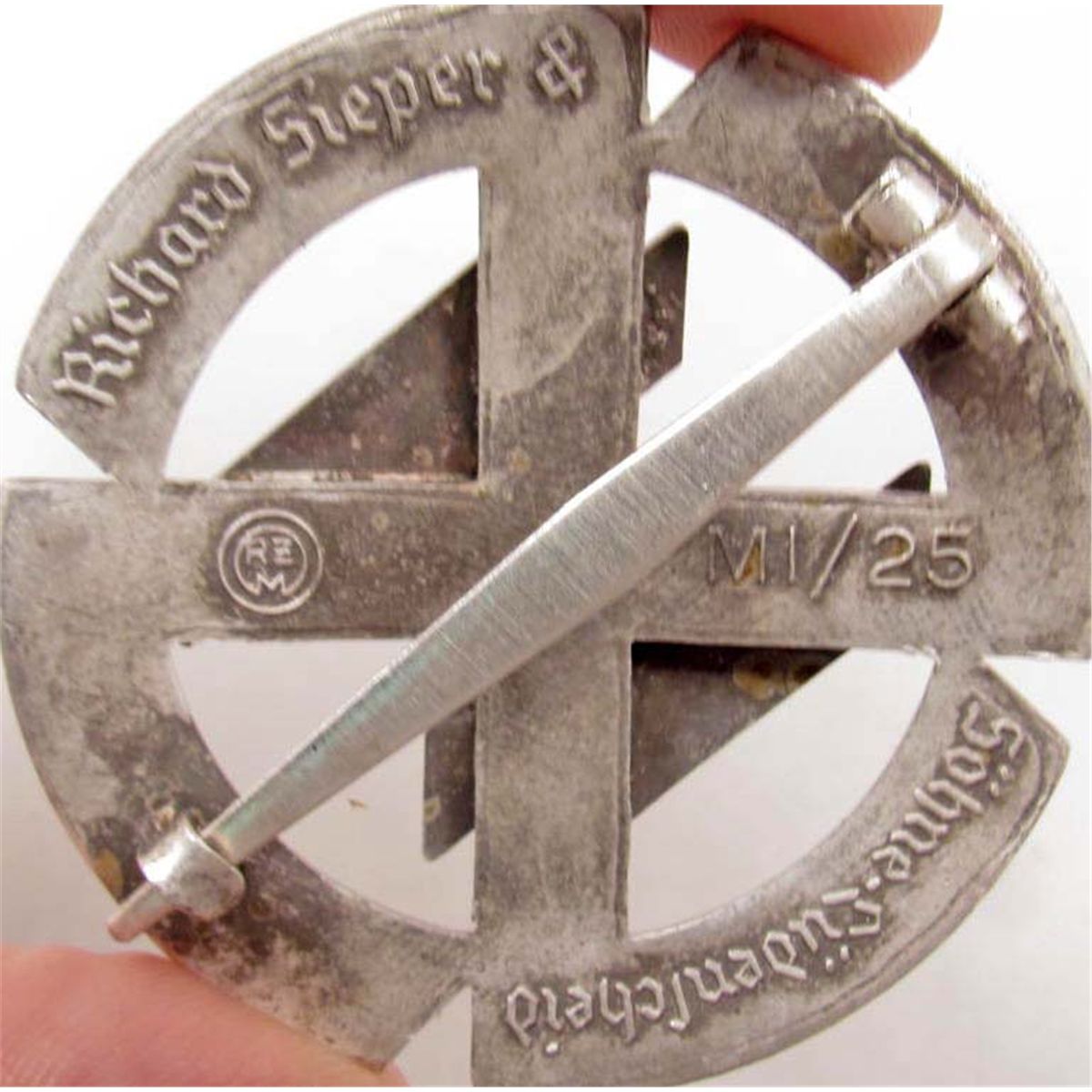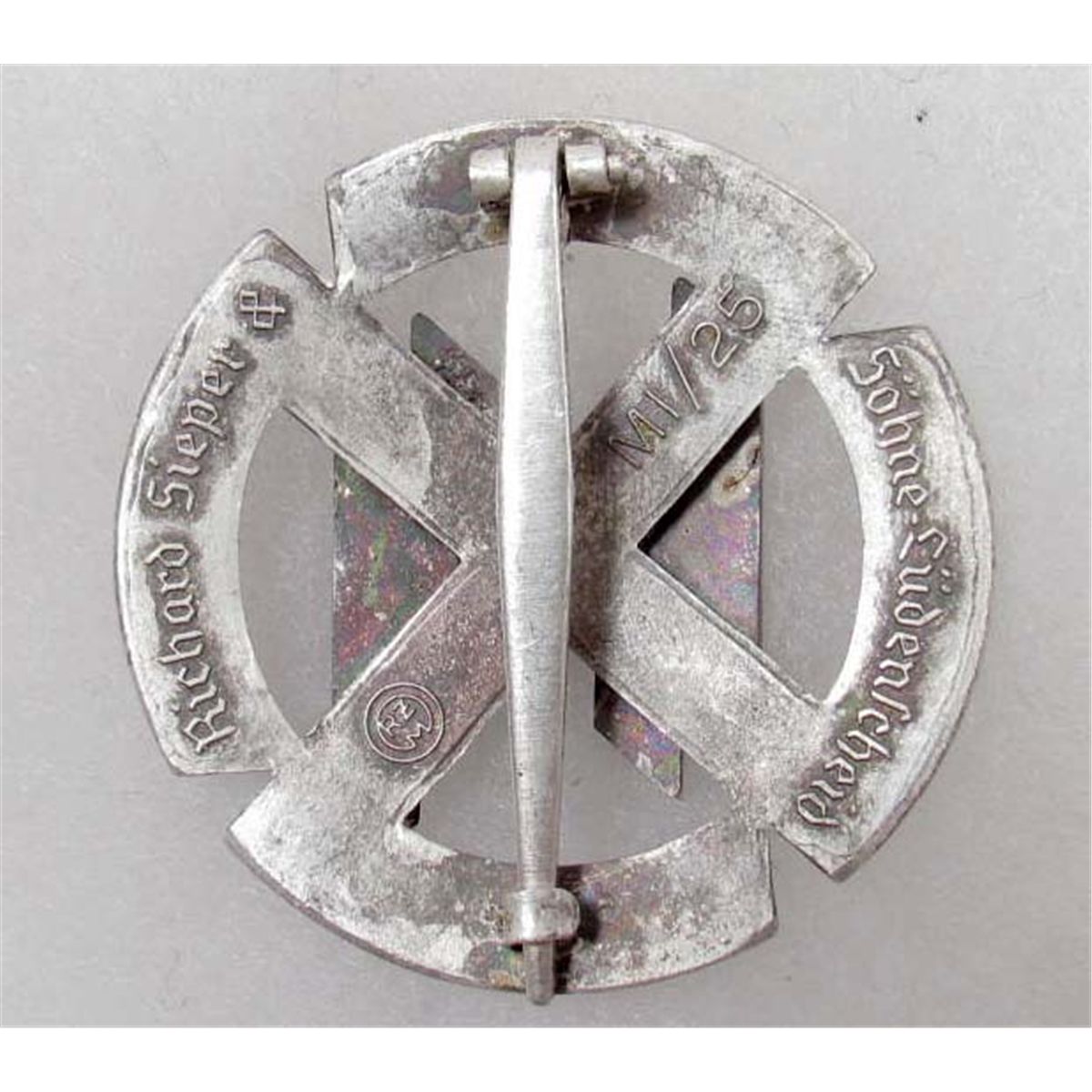 Measures 2+ in diameter. Maker marked Richard Sieper & Sohne Ludenscheid RZM M1/25. Has a pair of black enameled runics on the front. Has a wide vertical pin back.
