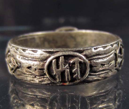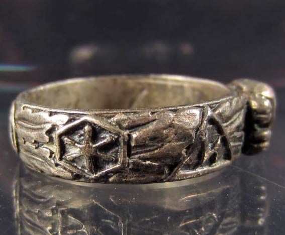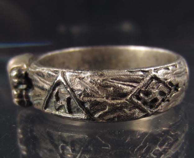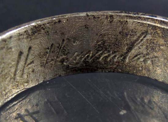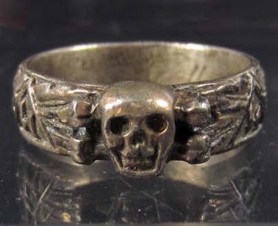 Has the skull and cross bones on the front w/ a swastika and SS runics around the sides. The inside is engraved H. Himmler.