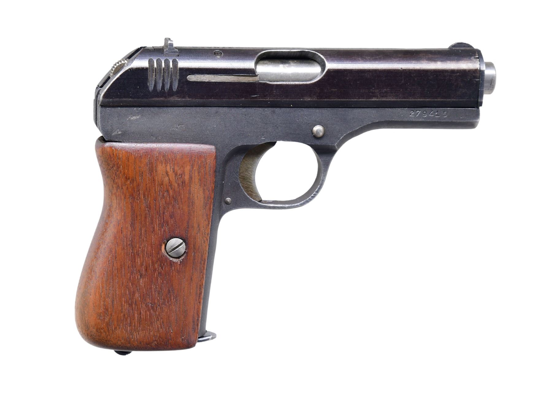 PISTOL. Cal. 7.65mm. S# 279415. Bbl. 3 3/4". Standard configuration CZ27 semi-automatic pistol mfg. in Czechoslovakia while under German occupation during World War II. Left side of the slide is marked with CZ's "fnh" mfg. code, followed by "Pistole Modell 27 Kal. 7,65". Right side of the frame is marked with an Eagle/WaA76 proof (also present on the bbl) and the S#. Frame exhibits a matte blue finish, with the slide and bbl. bushing exhibiting a standard blue finish. Trigger and hammer exhibit a straw finish, with the bbl. being polished in-the-white. Frame is mounted with a 1-piece plain wood wrap around grip. Fixed half-moon blade front sight, with dovetailed V-notch rear sight. All serialized parts are matching and include the frame and slide. MAGS: 1 8-rd. CONDITION: very good, with metal components retaining the majority of their original factory blue finish, exhibiting areas of light to mild wear and thinning overall. Strawed parts retain the majority of their original finish, with the front face of the trigger exhibiting wear through to gray patina. Brilliant mirror bore, exhibiting well defined rifling throughout. Wood grip show some superficial marks and minor impressions from handling and storage, but otherwise remains sturdy and serviceable. PROVENANCE: the Estate Collection of Charles Wagner. (25-304/MLW). CURIO. $500-700.