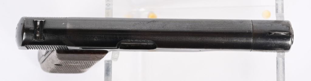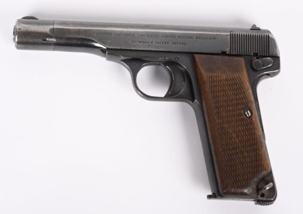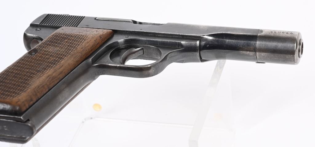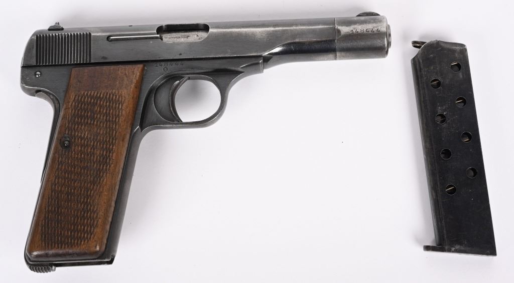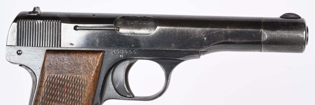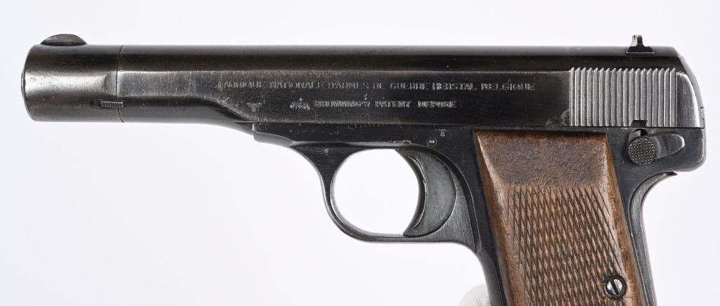 SERIAL NUMBER: 148444. BARREL: 4-1/2". CALIBER: .32 ACP/7.65MM. MANUFACTURED: 1940's. Made by FN, under German instruction. No import marks found. Matching serials on the frame, slide, barrel and barrel nut. "eagle/WaA149" Waffenamt on the left side of the slide. Blade front sight and v-notch rear. Original blued finish and checkered wood grips. Lanyard ring present on the left side of the frame. Includes original blued steel magazine, marked "FN/7.65MM" on the side, and numbered on the bottom (not matching to the gun). CONDITION: Metal is good overall, with light wear. Grips have wear and scratches. Bore is clean overall, with very good overall rifling. C&R