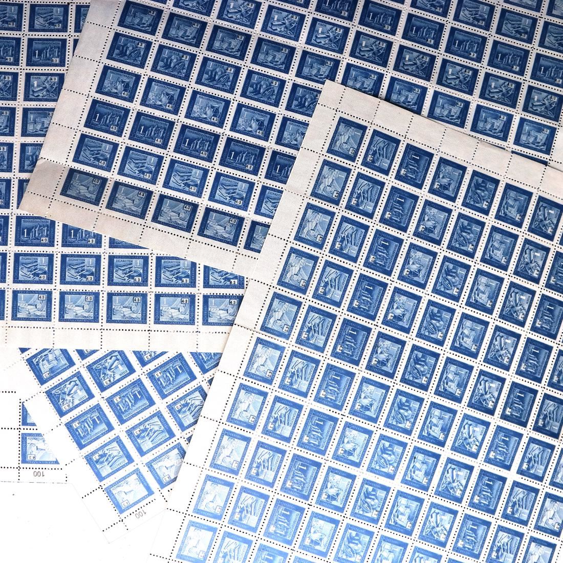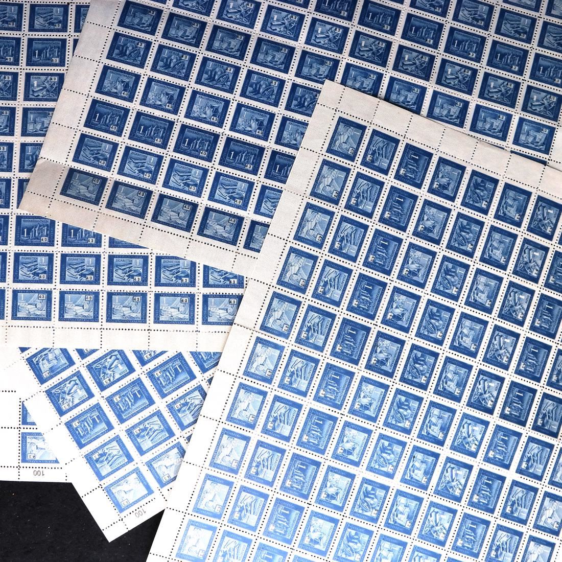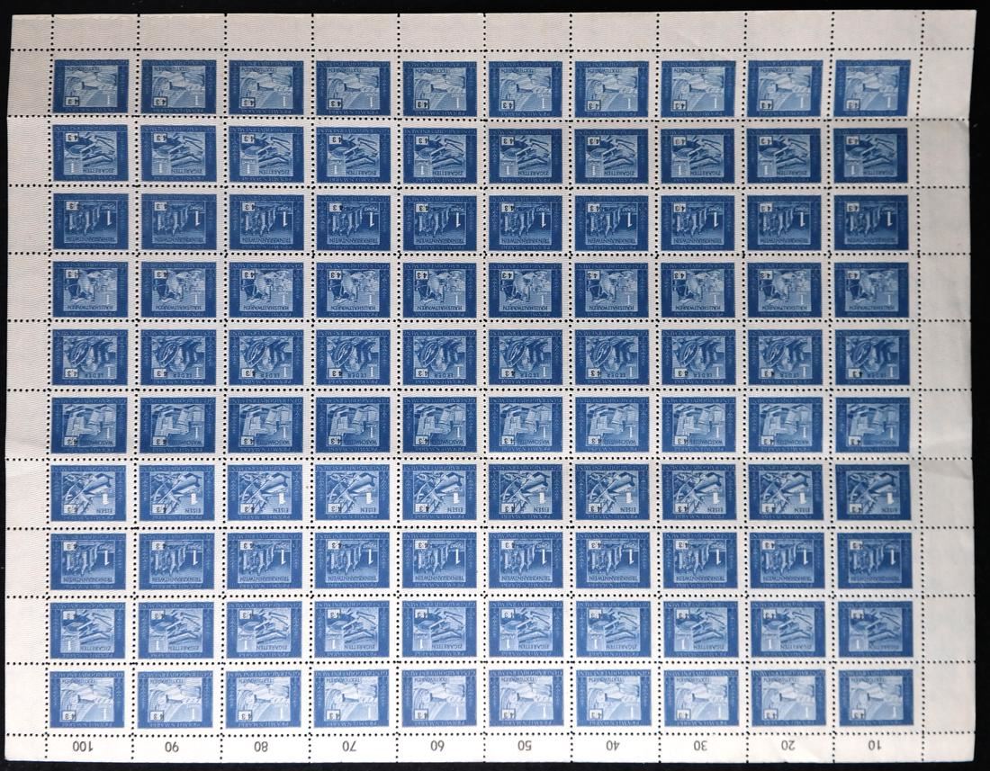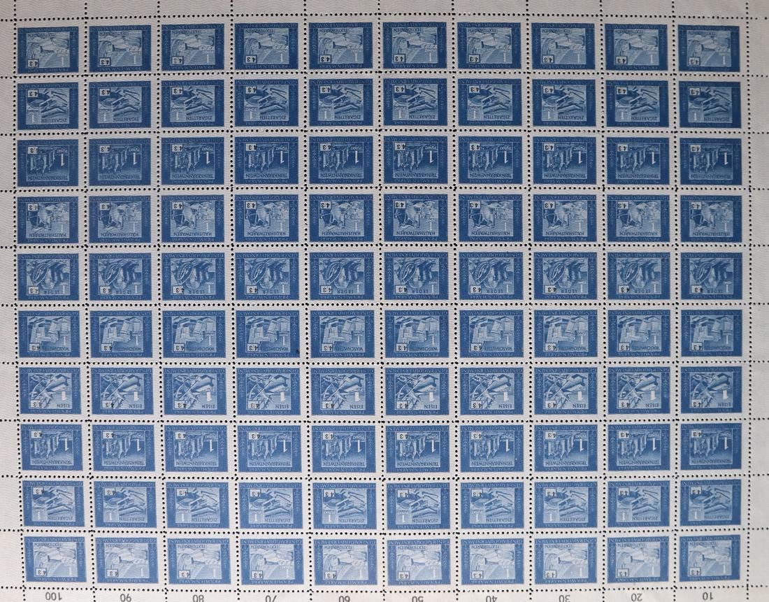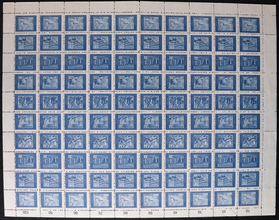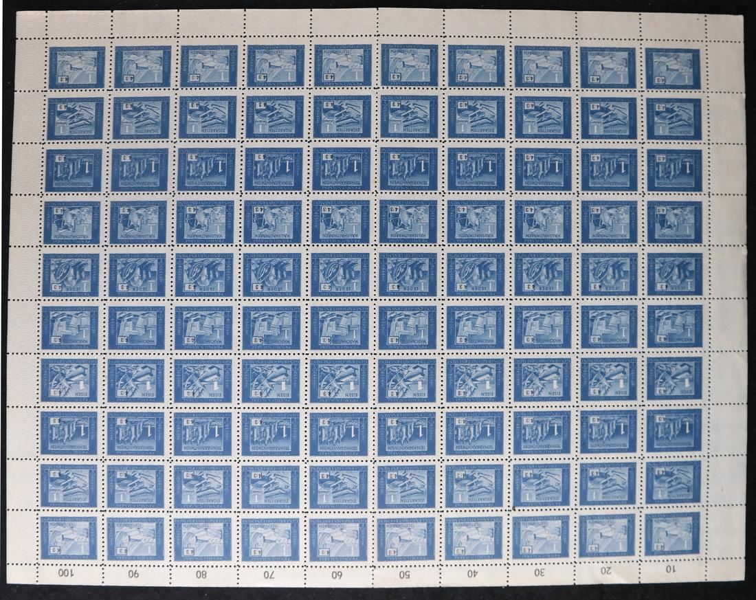 Five (5) complete sheets of 100 of the 1943 1 Punkt series 4/3 showing all seven different designs, unused without gum as issued, interesting opportunity for study, sound and VF.