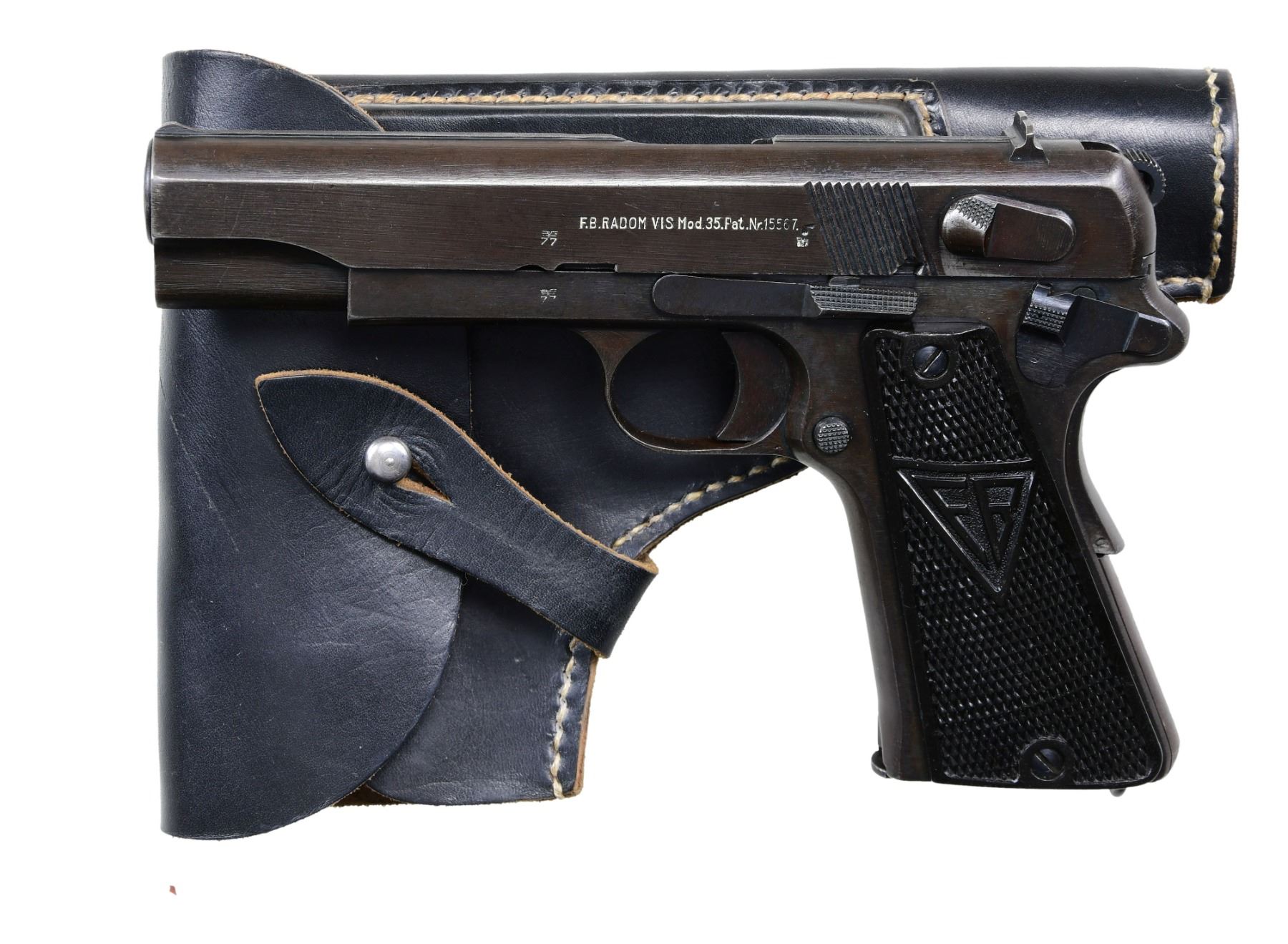 SEMI-AUTOMATIC PISTOL WITH HOLSTER. Cal. 9mm Luger. S# R4321. Bbl. 4 5/8". wz.35 (German designation: "P.35(p)") semi-automatic pistol mfg. in Poland at the Radom arsenal while under German occupation. Left side of the slide is marked "F.B.RADOM VIS Mod.35.Pat.Nr.15567." above a Radom Eagle/77 proof, a German eagle firing proof, as well as a Steyr Eagle/623 proof (indicating final assembly at Steyr). Sides of frame exhibit a Radom Eagle/77 proof, with the bbl. exhibiting a Steyr Eagle/623 proof. Metal components exhibit a blue finish overall, save for on the bbl., which is polished in-the-white. Frame is mounted with 2-piece checkered black synthetic grips, with "FB" on the left panel and "VIS" on the right. Slide features a matte rib, with a fixed blade front sight and dovetailed V-notch rear sight. All serialized parts are matching and include the frame, slide, and bbl. MAGS: 2 blued 8-rd. UNATTACHED ACCESSORIES: unmarked reproduction black leather holster. CONDITION: good, with metal components retaining the majority of their original arsenal blue finish, exhibiting some areas of light to mild wear and thinning, as well as scattered spots of light to mild surface oxidation overall. Bright bore, exhibiting consistent light to mild pitting, while retaining well defined rifling throughout. Grips are good, showing some smoothing, as well as some superficial marks from handling and storage. Holster is very good overall. (24-6864/MLW). CURIO. $1,000-1,500.