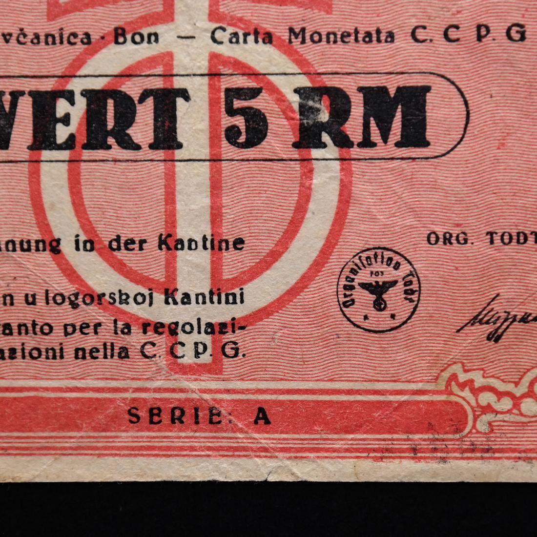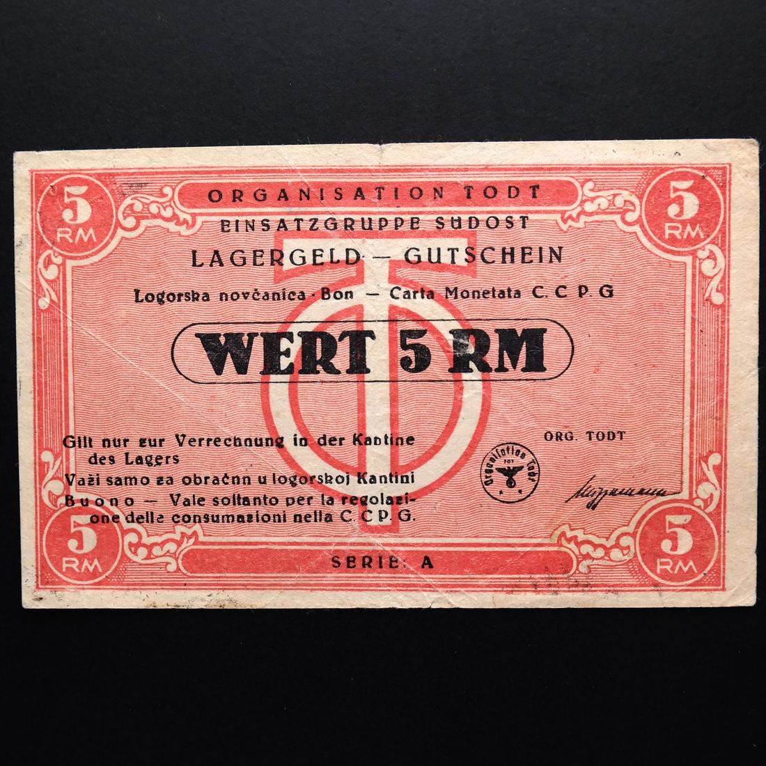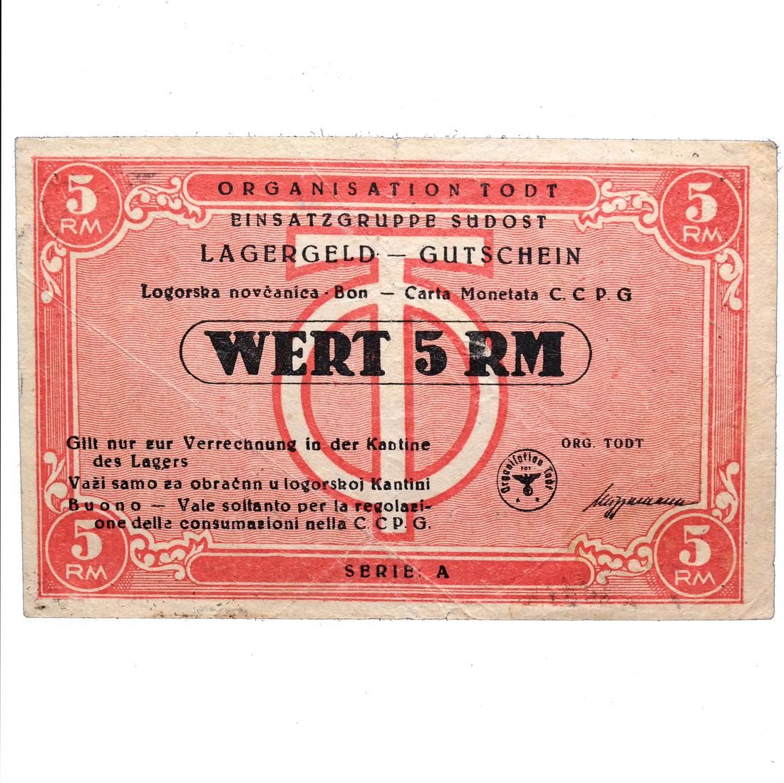 Organisation Todt / Einsatzgruppe Sdost / Lagergeld - Gutschein 5RM coupon/note, Southeast headquarters were in Belgrade, creases, stains, pinholes and two small edge tears, F-VF.