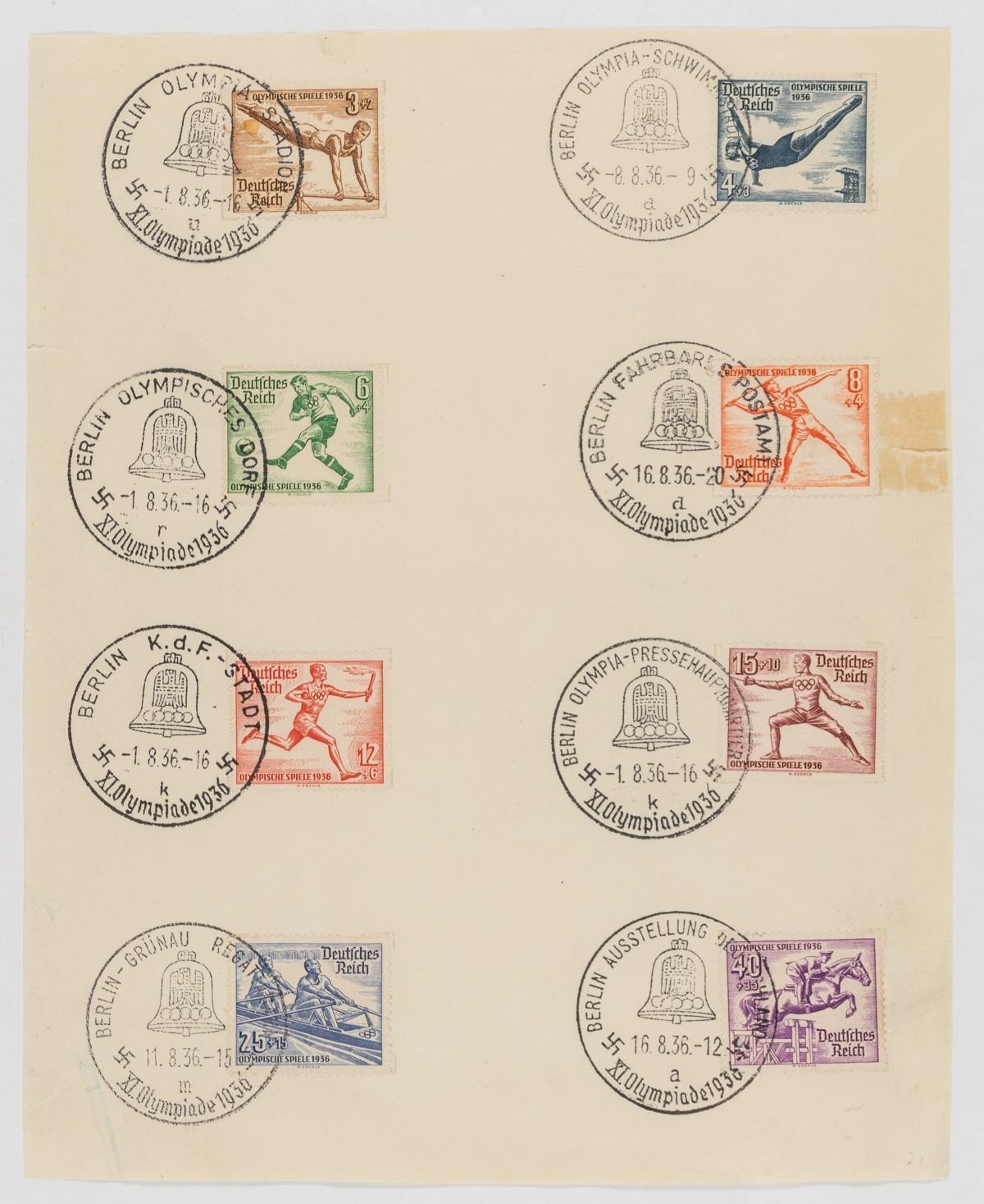 Cancelled sheet of eight German stamps to commemorate the 1936 Olympics held in Berlin. Each stamp is a vignette of an athlete competing in an Olympic sport. Each stamp is cancelled with an ink stamp dating it to 1936. The ink stamp shows a bell with an eagle over the Olympic rings and two mobile swastikas. 8 x 6.5 inches.