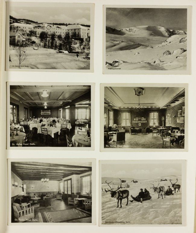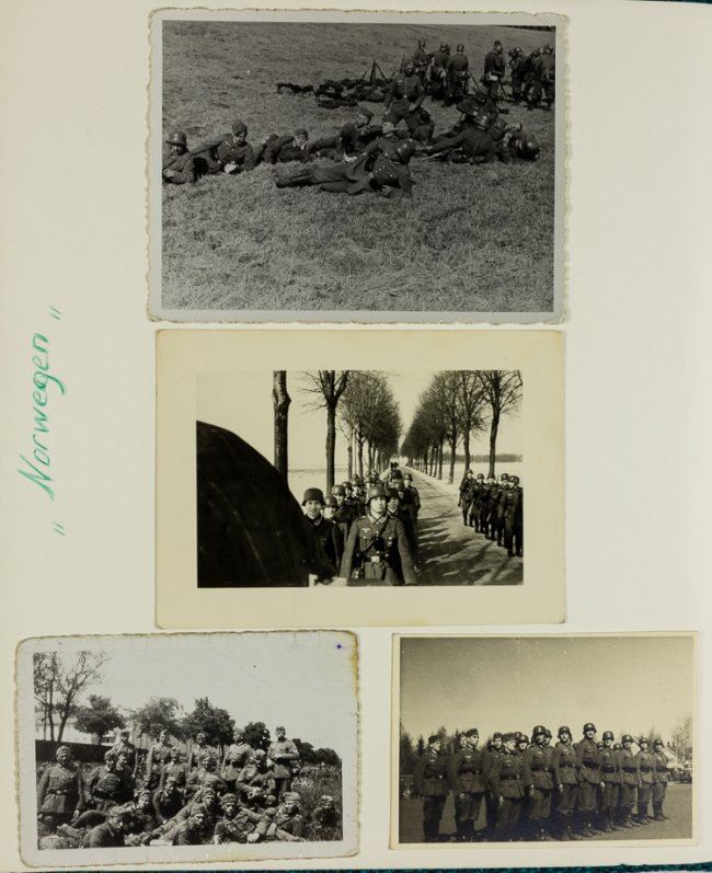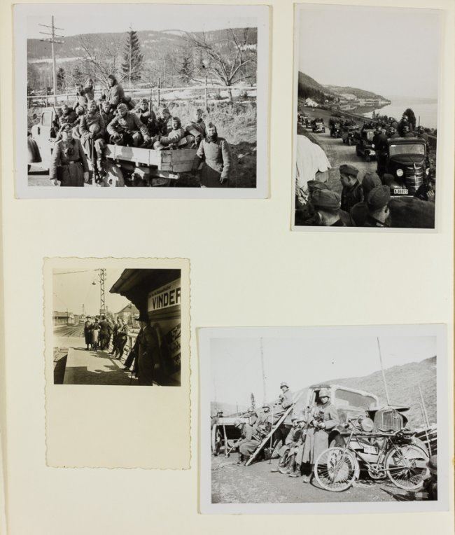Collection of about 150 photographs of German military personnel in Finland and Nrway, likely assembled by a single soldier, placed in a more modern album. Photos average about 3" x 4 1/4" and scenes include alpine troops with skis in the field, smaller-sized tanks, marches, soldiers' graves, wrecked and burning buildings and bridges, soldiers in winter garb on the front in Finland, female collaborators, etc. Very good.