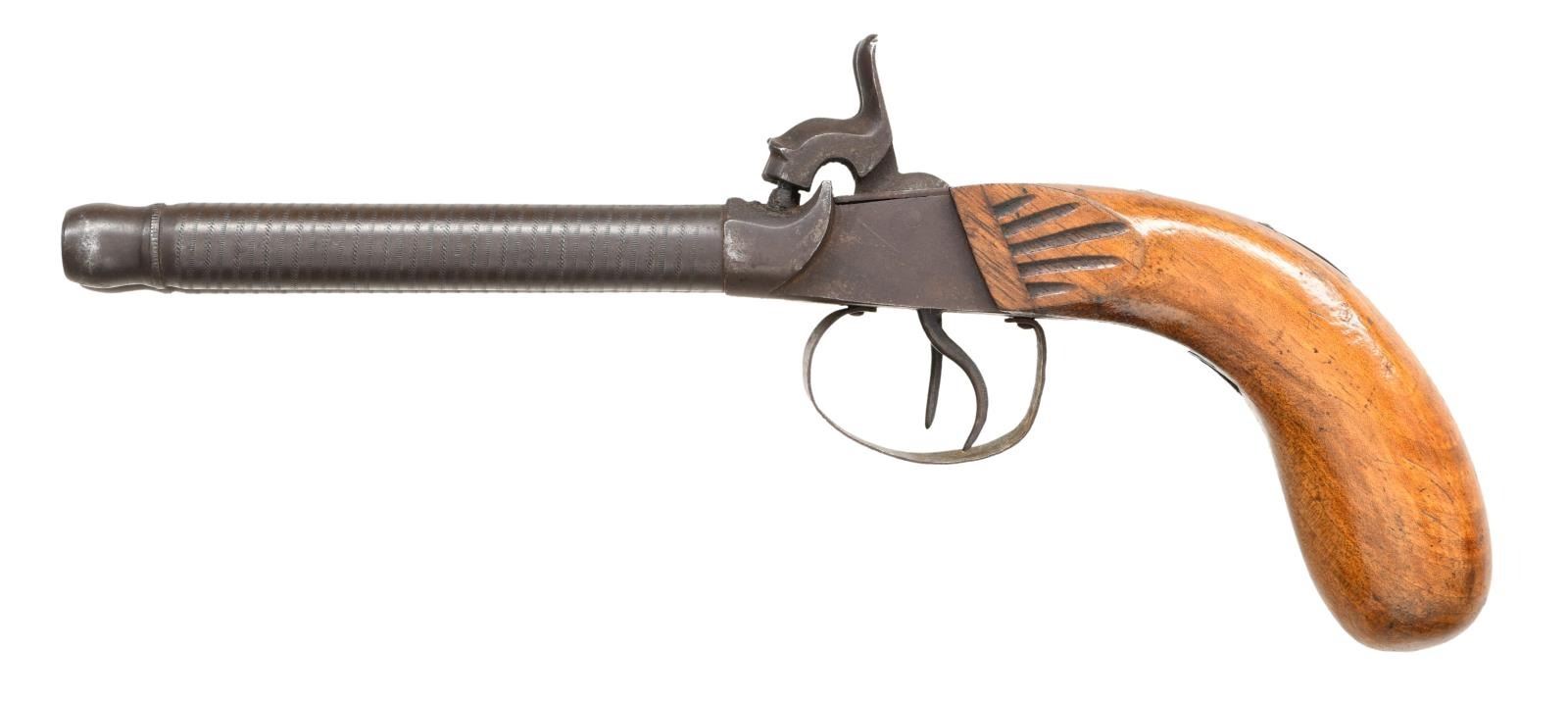 Cal. 44. NSN. Bbls. 5" w/ cannon muzzles. Double hammers. Double triggers w/ one trigger being curved & other straight. Bbls. have East German proofs. No other visible markings. Hardwood grip. CONDITION: grip has added varnish w/ some chipping, scattered dings & handling wear. Metal is a gray patina w/ some scattered pitting & oxidation. Oxidized rifled bores. (01-23628/MJC). ANTIQUE. $100-300.