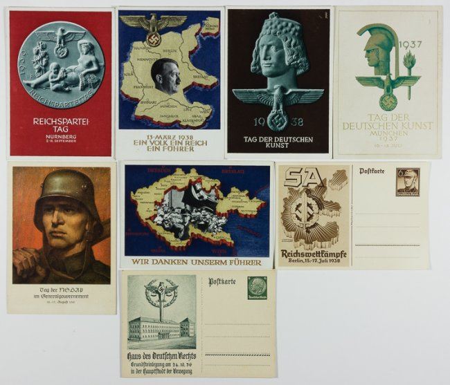 Good lot of eight German political postacrds, includes a card picturing Hitler and celebrating the Anchluss, cancelled in Vienna Apr. 10, 1938; a card thanking Hitler and picturing him; with other cards honoring Culture Day, the S.A., Reichs Party Day, N.S.D.A.P. in General Government Day (cancelled in Krakau), etc. Fine.