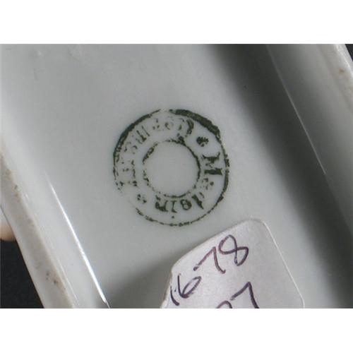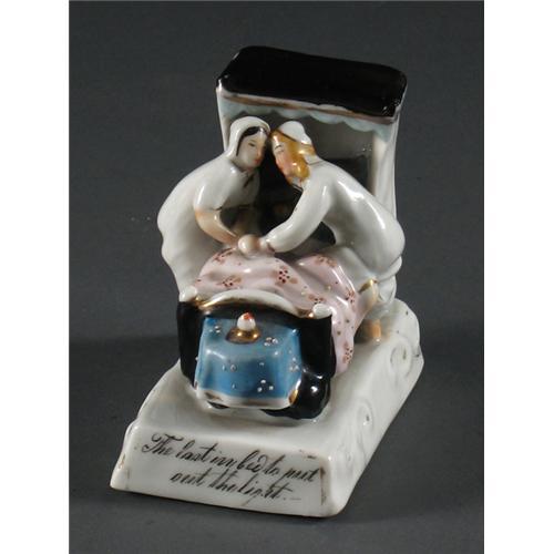 FAIRING: A German porcelain fairing (a gift, especially one bought or given at a fair) depicting a miniature grouping of two girls getting into bed with the title hand painted on front of base, ''The last in bed to put out the light.'', ''Made in Germany'' marked on bottom, 3'' x 2 1/4'' x 3'', no damage noted.