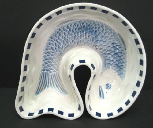 GERMAN PORCELAIN FISH MOLD. Blue decorated. Stamped on bottom "Germany" and marked with impressed beehive mark and "829/2". Shows one chip at bottom. And one spider crack is visible from bottom on exterior and on interior. 2.5" H, 9" W