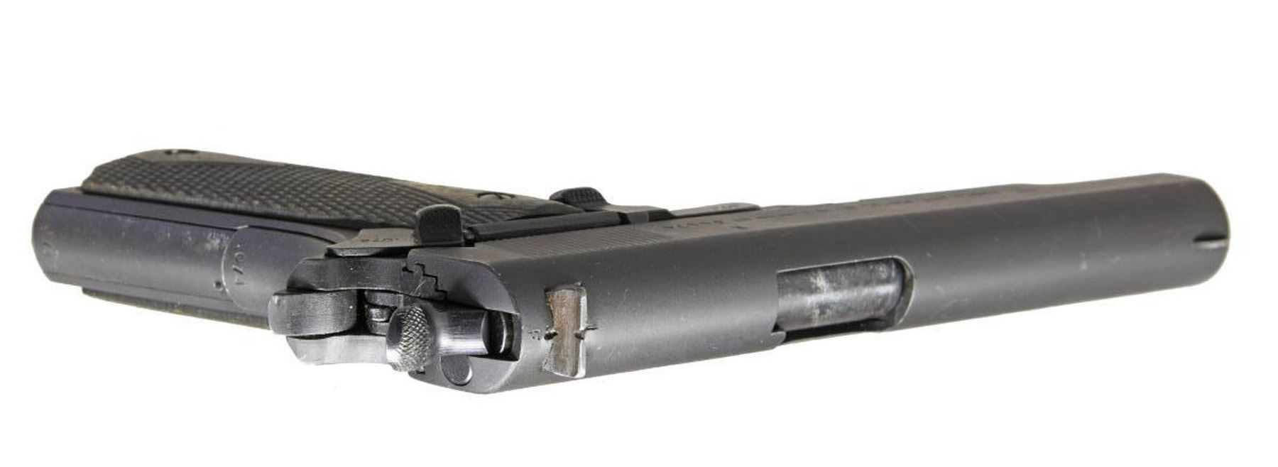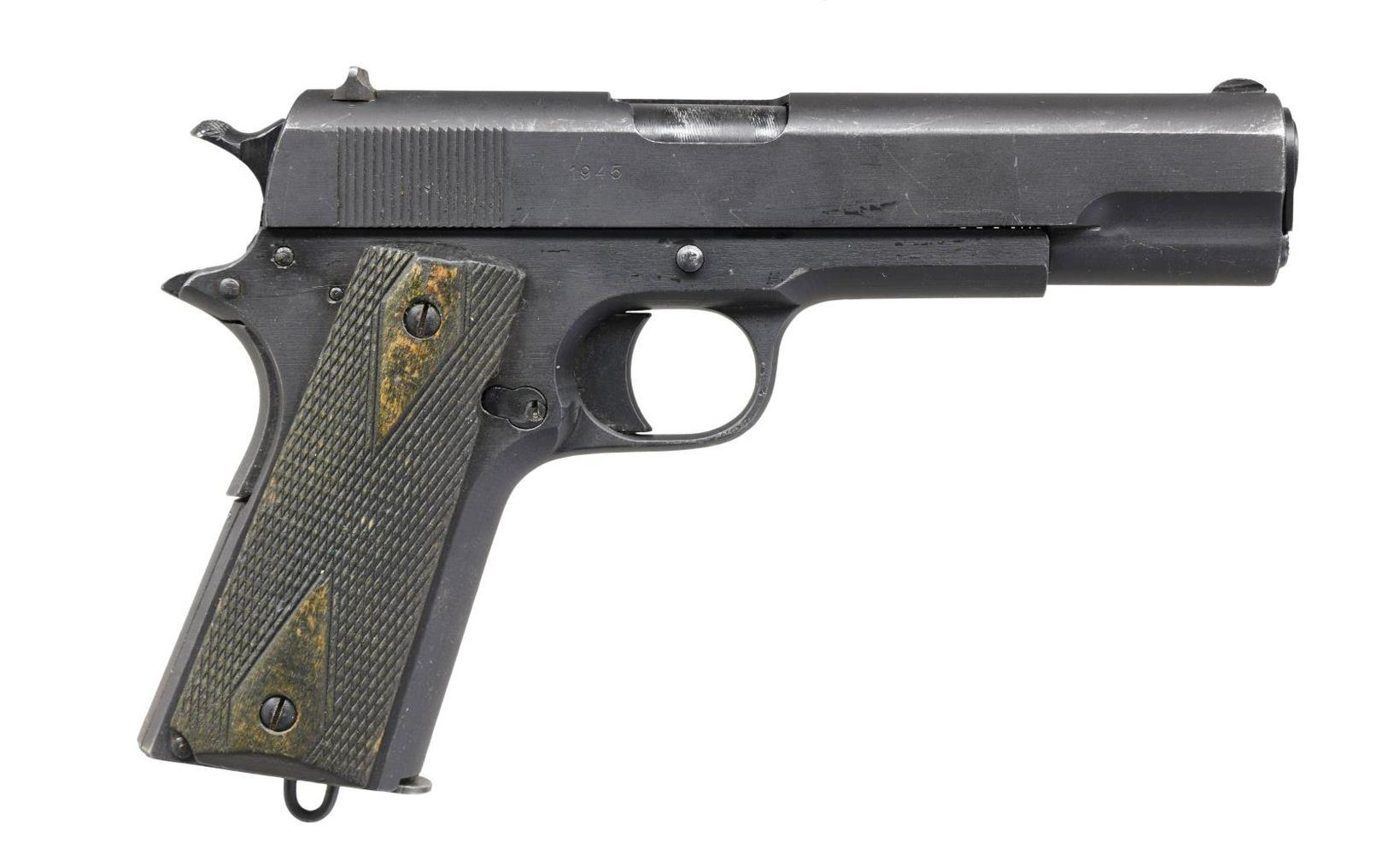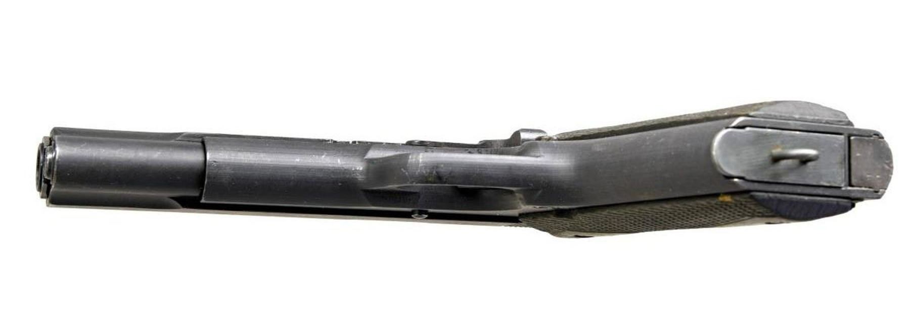 PISTOL. Cal. 4ACP. S# 30074. Bbl. 5" with matching number. Mfg. 1945 under German occupation within proper serial range of 29261-30523; internet reference states only 30 to 50 known. Jan Still's reference states only 1,000 made in 1945. Originally, the Model 1914 had about every part numbered including the ejector; as time passed, fewer parts were numbered for expediency. Matching numbers on this pistol are: frame, slide, barrel, slide stop, trigger, thumb safety, grip safety and mainspring housing. Some examples had case colored or in the white hammers (this one is blued). Extractor appears fire blued as are most examples. Typical black stained double diamond checkered light colored hardwood grips. Eagle party symbol over "Wa484" proof on left side of slide before caliber marking. Side of sear appears to have Springfield eagle proof. Recoil spring is modern blued replacement. MAGS: 1 good unmarked 7 rd. with lanyard loop. UNATTACHED ACCESSORIES: Early Norwegian style tan holster in very good to excellent condition. Has internal lift strap and single wide belt loop. No visible markings. CONDITION: very good plus with function wear showing at ejection port. Very light high point wear. Very light hand wear to grips. Bore is very good having faint, even frosting yet still shinny. (23-4755/NW). CURIO. $5,000-7,000.