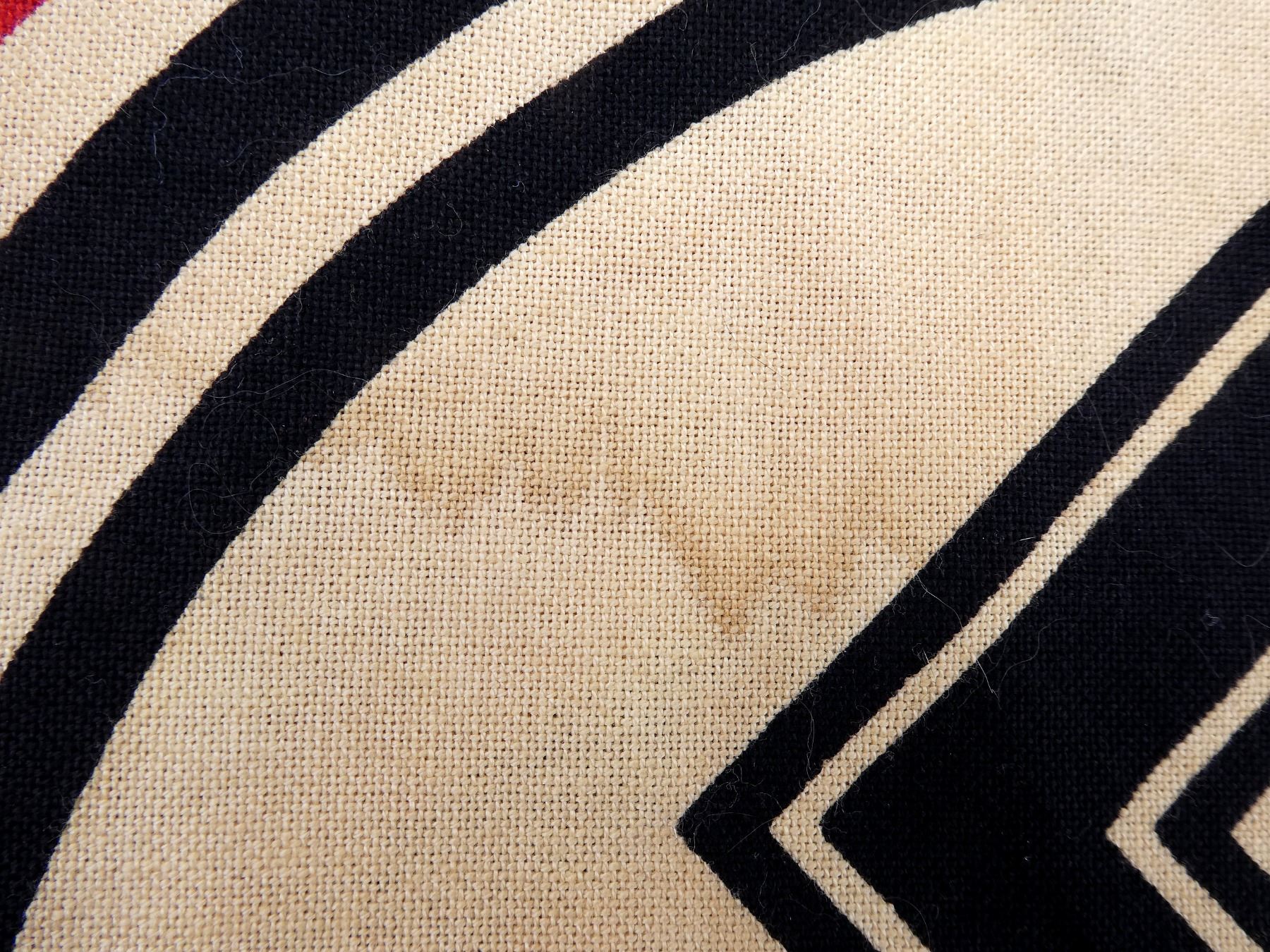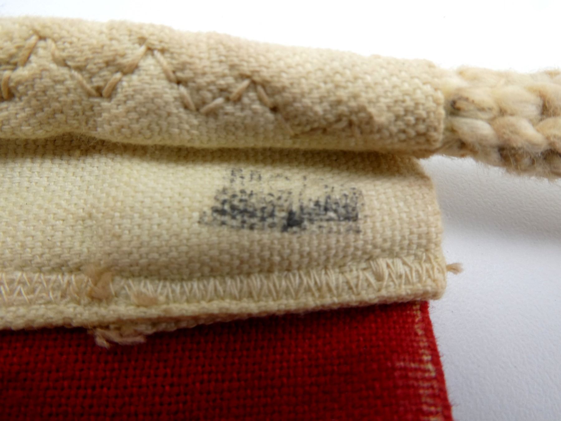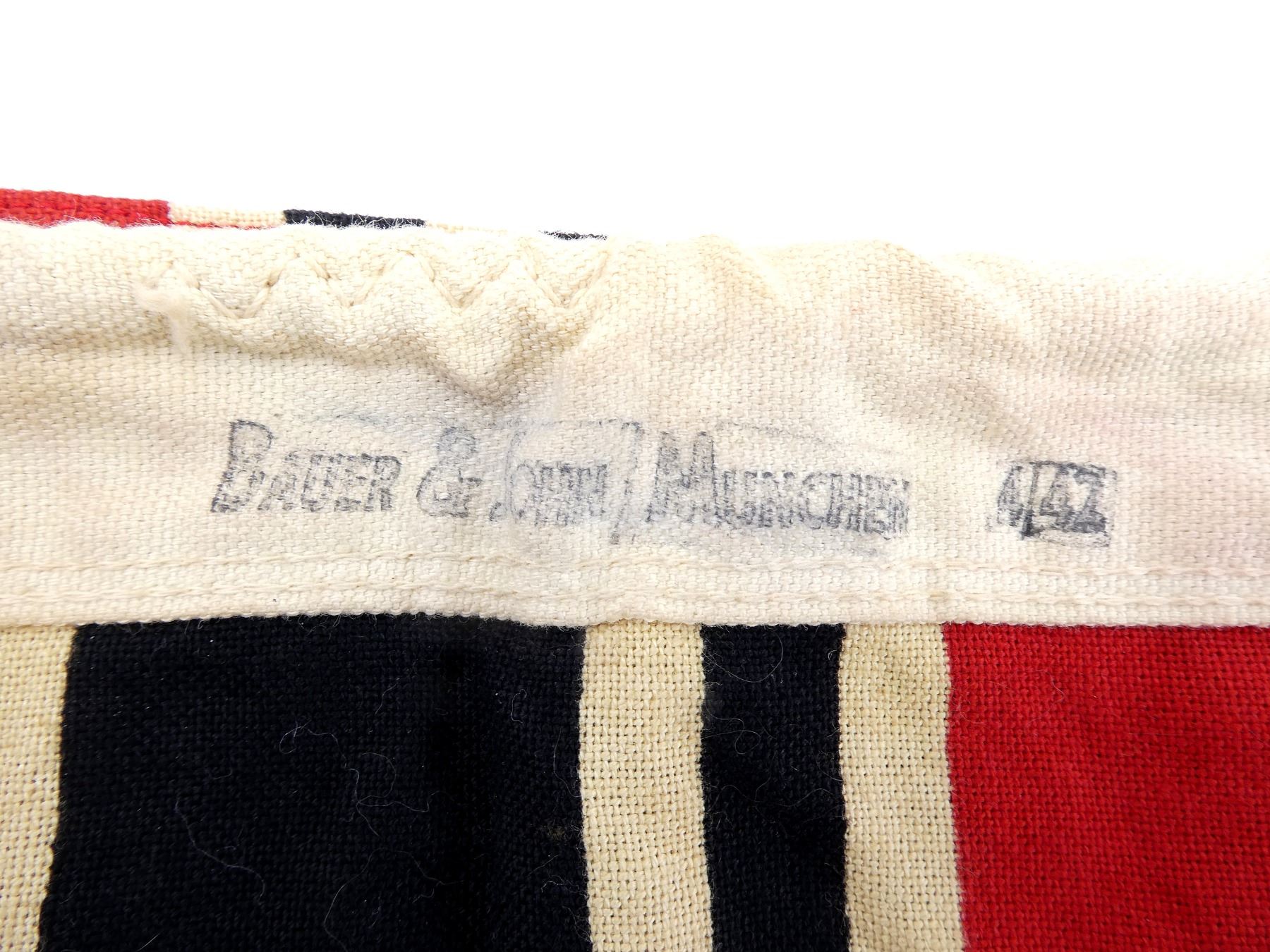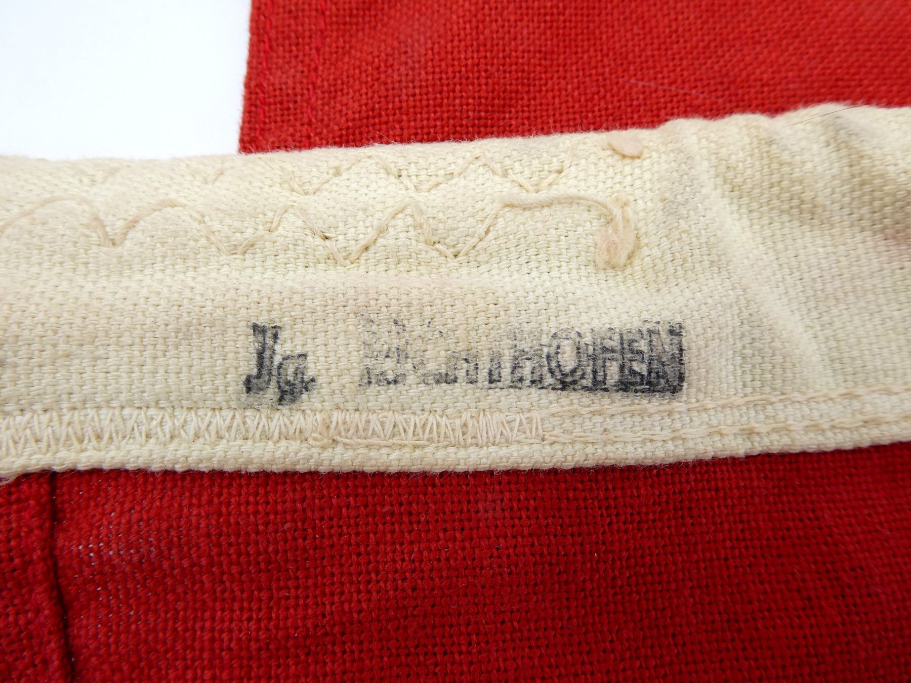 (1) RED / WHITE / BLACK ROUGH COTTON FLAG WITH PRINTED SWASTIKA / CROSS EMBLEMS, FLAG POLE EDGE MARKED: "JG, ??CHTHOFEN", "BAUER & JOHN / MUNCHEN, 4/42" & FAINT / UN-CLEAR INK STAMP MARKING, ROPE ON FLAG POLE SIDE, FLAG DOES NOT GLOW UNDER BLACK LIGHT, CENTER OF ROPE GLOWS UNDER BLACK LIGHT, SHOWS WEAR, APPROX. 36" X 23.5". SEE PHOTOS.