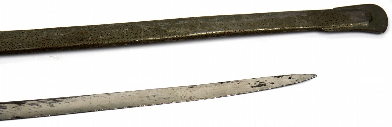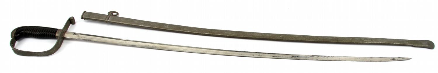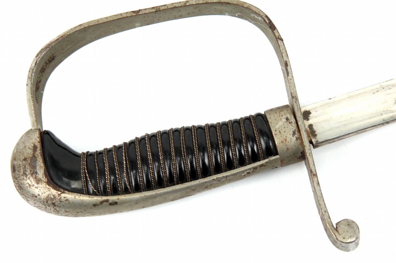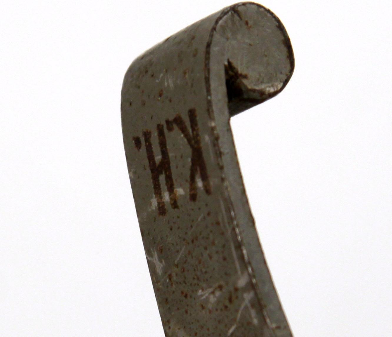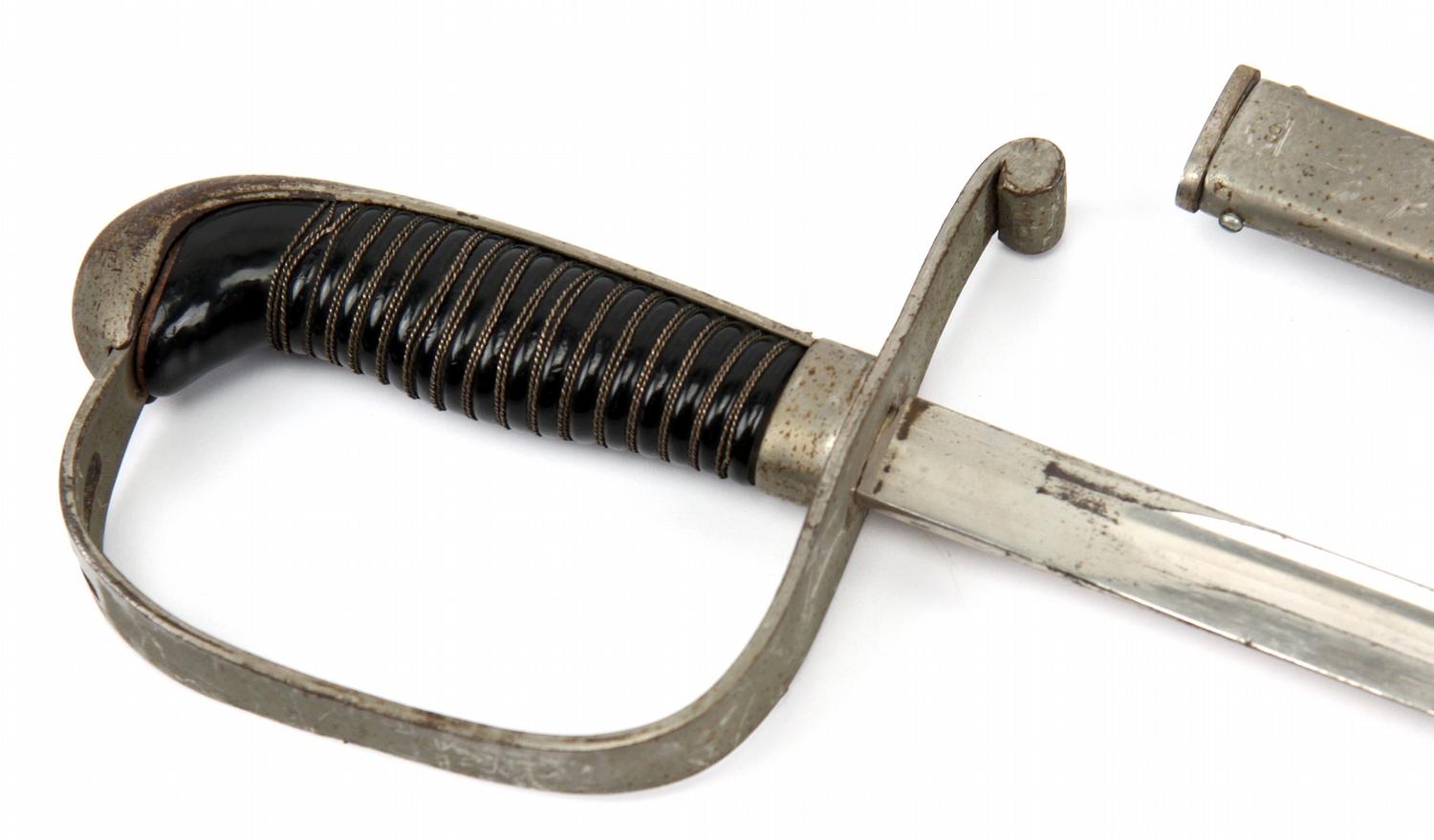 German Reichswehr Army enlisted saber. 33 inch single fuller blade, wire wrapped black celluloid grip. Top of cross guard marked "K.H.", no makers mark on ricasso. Rolled steel scabbard, with single hang ring. Blade shows some wear, scabbard and hilt show some oxidization. Slight bend in scabbard Overall good condition.